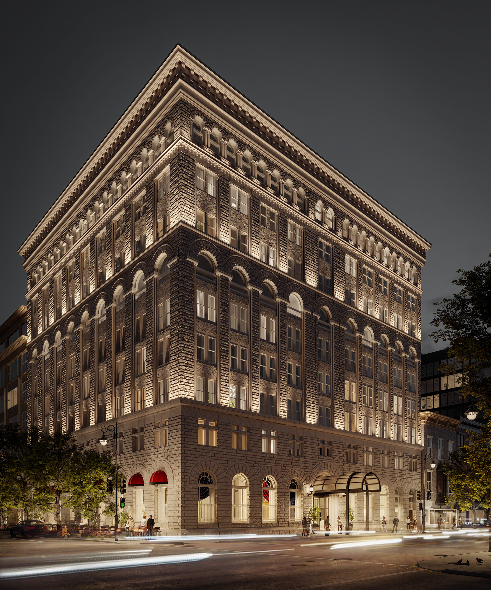 Aesthetic: The look nods to the building’s grand 19th century architecture, with brass accents, lush textiles, and a rich color palette. The bank’s barrel-vaulted lobby will remain intact in the reception area, and its original boardroom will become a two-bedroom suite. (The interior design is by Jacu Strauss, creative director of Lore Group, the hospitality company that runs the hotel. Architecture firm Perkins Eastman also helped with the remodel.)