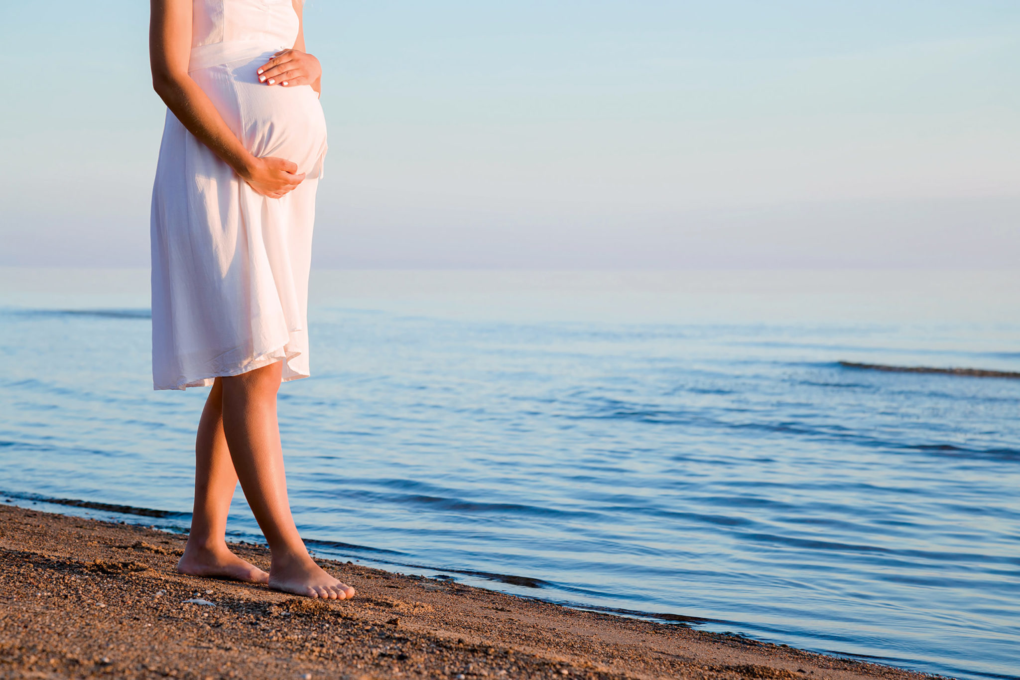 Baby-bump photo op: Standing barefoot at water’s edge during the golden hour just before sunset.