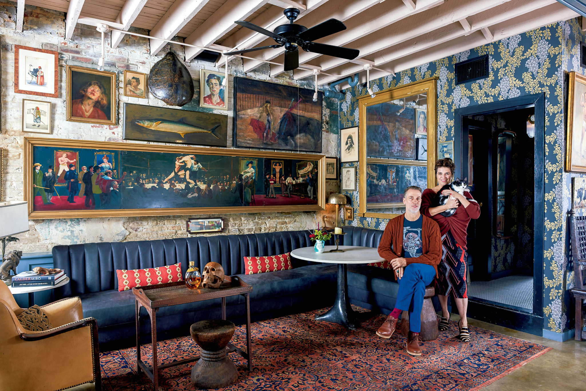 Upstairs, crisp white walls, tall windows, and a wooden floor painted with a blue-and-white herringbone pattern create a sunnier mood. Suspended from the ceiling, a floral Turkish textile and an oversize oil painting screen off the sleeping nook with its red four-poster bed. But the Kahoes spend most of their time in the adjacent living area, where a wall of black built-in bookcases—filled with design titles, novels, and such curiosities as a carved wooden skull—faces two weathered Scandinavian leather sofas. After long days at GoodWood or buying antiques at auctions, the couple relaxes by watching documentaries or snuggling with cats Electra and Paco. Says Anna: “We wanted it to feel like a bright hotel suite with a gypsy and circus spirit.”