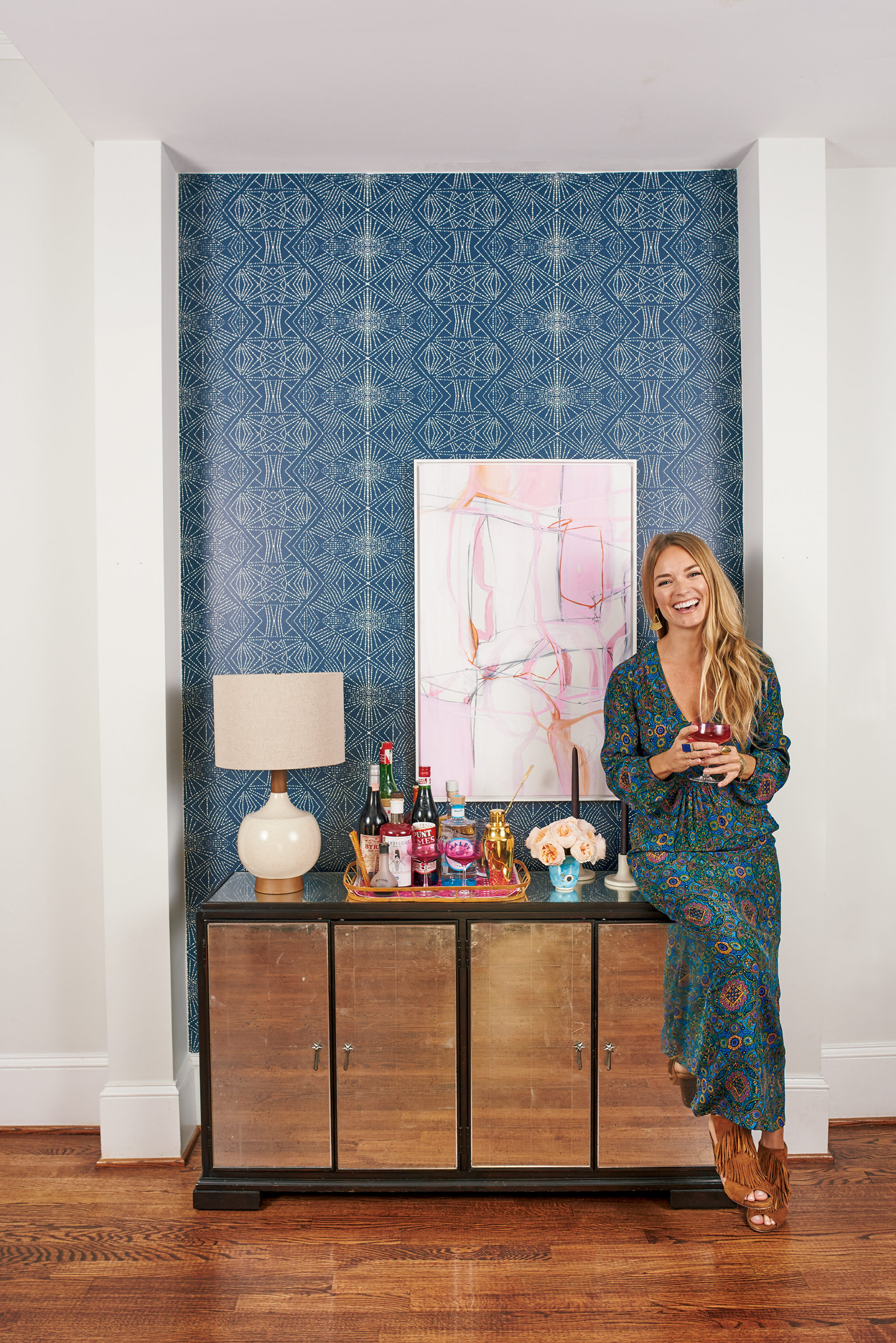 Sitting in her living room, Amanda McClements is surrounded by a delightful mix of decor: a high-backed rattan peacock chair, a love seat draped with a blue-and-white shibori-dyed throw, plants everywhere. “I’m constantly having a design identity crisis,” she says. “I’m into a West Coast 1970s vibe, but I also love an antique New Orleans mansion dripping with velvet.”