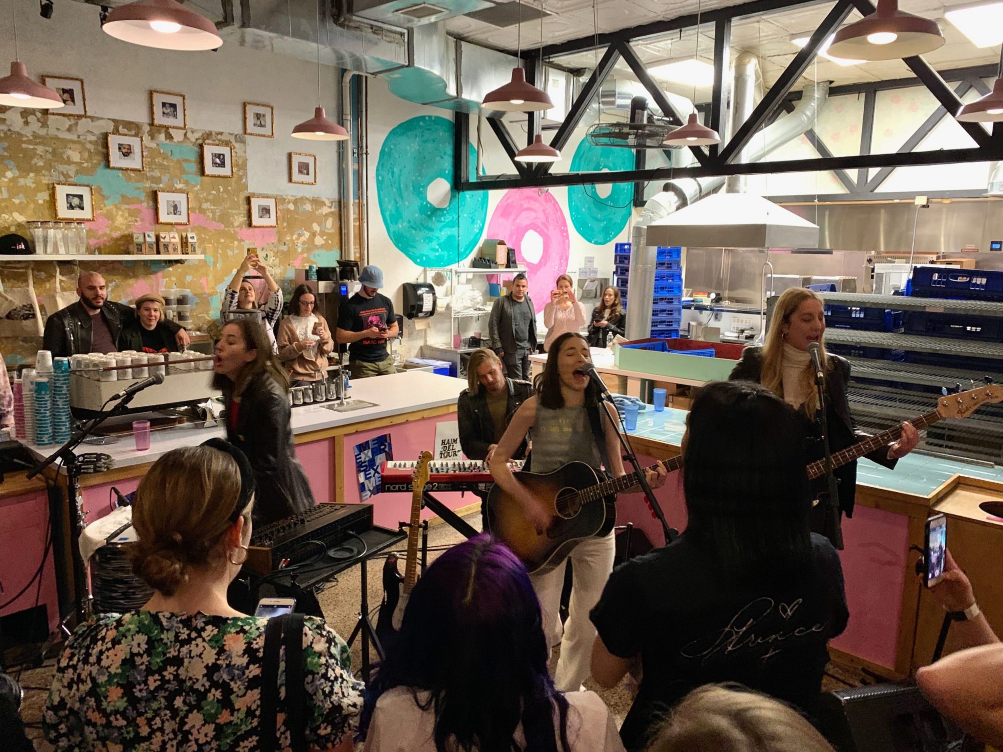 Call Your Mother’s interior is a small but vibrant space with framed photos of Drake and his mom adorning the walls. Tonight, the tables were replaced by amps, speakers, and guitar stands. Folks meandered around the space eating free bagel sandwiches and collecting swag bags with Haim Deli Tour merch.