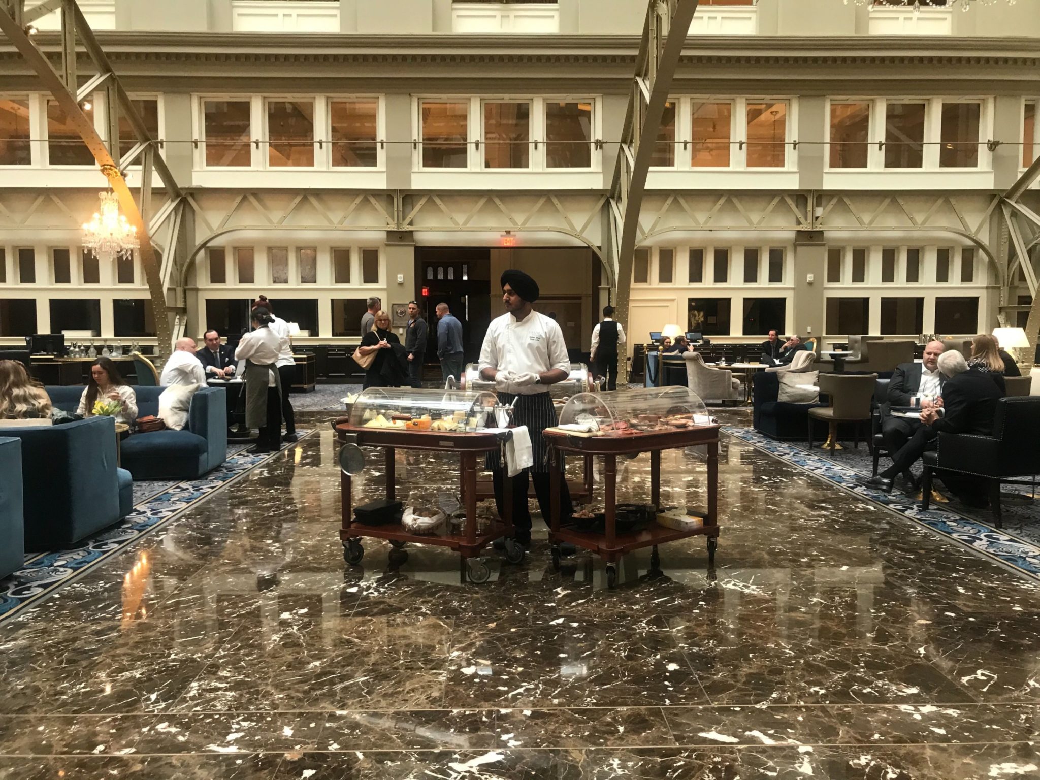 Even with the extra precautions, hotel-goers weren’t exactly flocking to the cheese, at least not early in the evening. From the time I arrived at around 5:30 PM, not a single person approached the carts in a 20 minute span. The most action the cheese got was a selfie with six employees. (For $29, the hotel offers five cheeses plus homemade bread. For $49, a “grand tasting” is also available.)