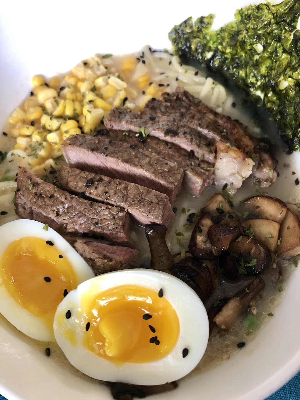 Method: First, Valenzuela scours the fridge to figure out what he has on hand. His best off-the-cuff creation so far, he says, has been tonkatsu ramen topped with slices of ribeye, sauteed cremini mushrooms, corn, a soft-boiled egg, black sesame seeds, and a sheet of nori. Another favorite: miso ramen with roasted pork belly, teriyaki chicken, kimchee, corn, and the nori/soft-boiled egg/sesame seed finish is another favorite.
