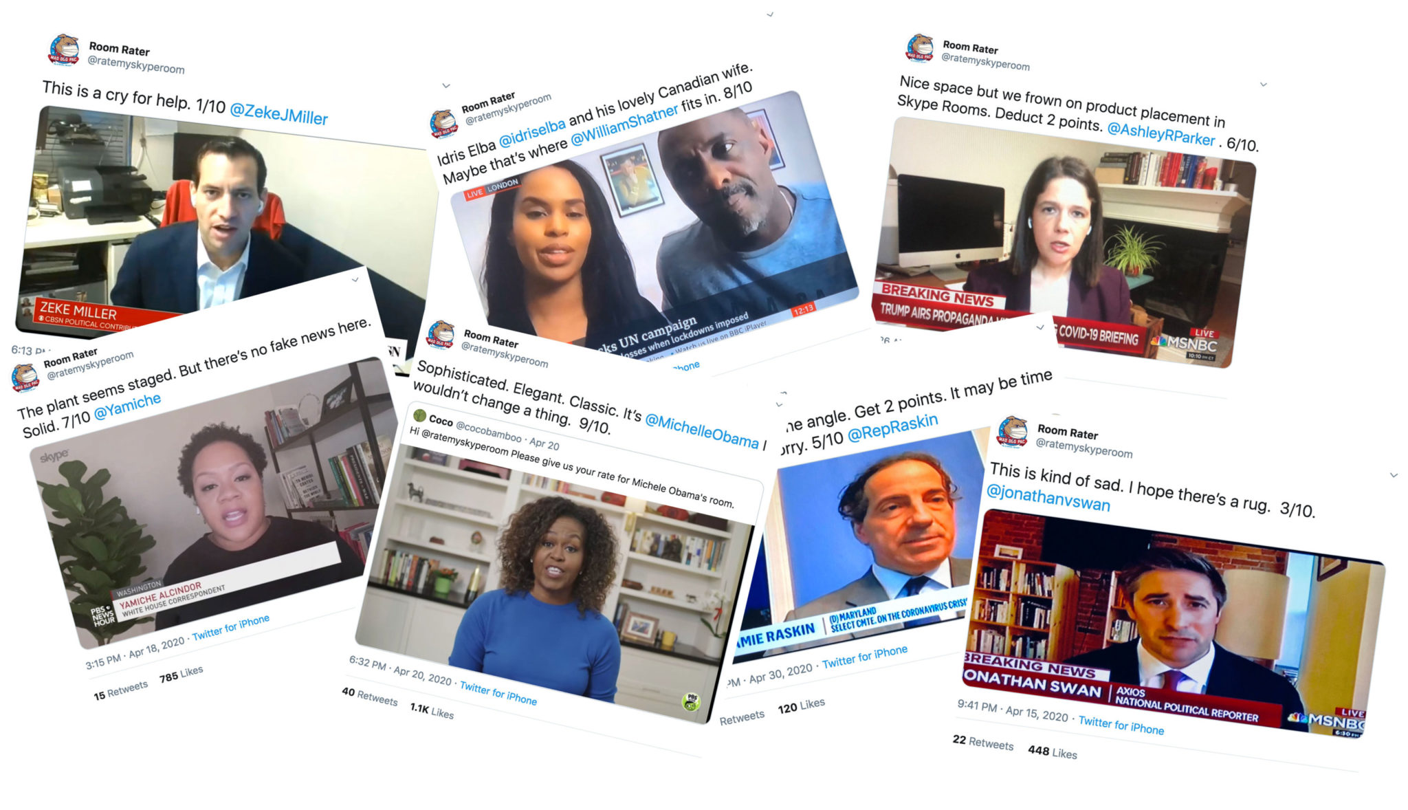 The coronavirus shutdown has forced news commentators to broadcast from their homes, allowing us to get a peek at their decorating choices. And to nobody’s great surprise, some TV personalities have better taste than others. That’s the premise behind the Twitter account Room Rater (@ratemyskyperoom), which has racked up 120,000 followers in just a few weeks simply by tweeting TV-news images of people at home and assigning a rating to whatever decor is visible, based on anything from plants to art to lighting to bookshelves.