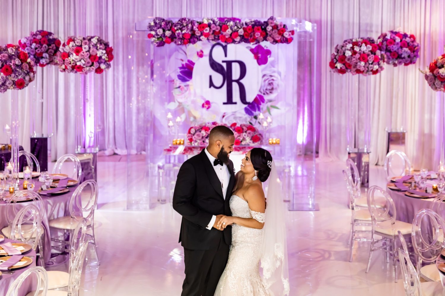 Photographer: Tunji Studios | Planning & Design : Andrew Roby Events | Venue and Cake: MGM National Harbor | Florist: Bella Fiori Flowers | Makeup Artist: Glam Qui | Hair Stylist: Unique Berry Hairs | Bride’s Attire: Yemi Kosibah | Groom’s Attire: Miguel Wilson Collection | Bridesmaid Dresses: House of JonLei Atelier | Videographer: Yanair Photography | Lighting & Floor Design: The Light Source Company | Rentals: Something Vintage Rentals (furniture); Select Event Group (ghost chairs); Accent Event Rentals ( bride and groom seating); Nuage Design & BBJ Linen (linens) | Photo booth: Focus and Fabulous | Transportation: Vintage Limos, Xatric Best Limo & American Eagle Limo