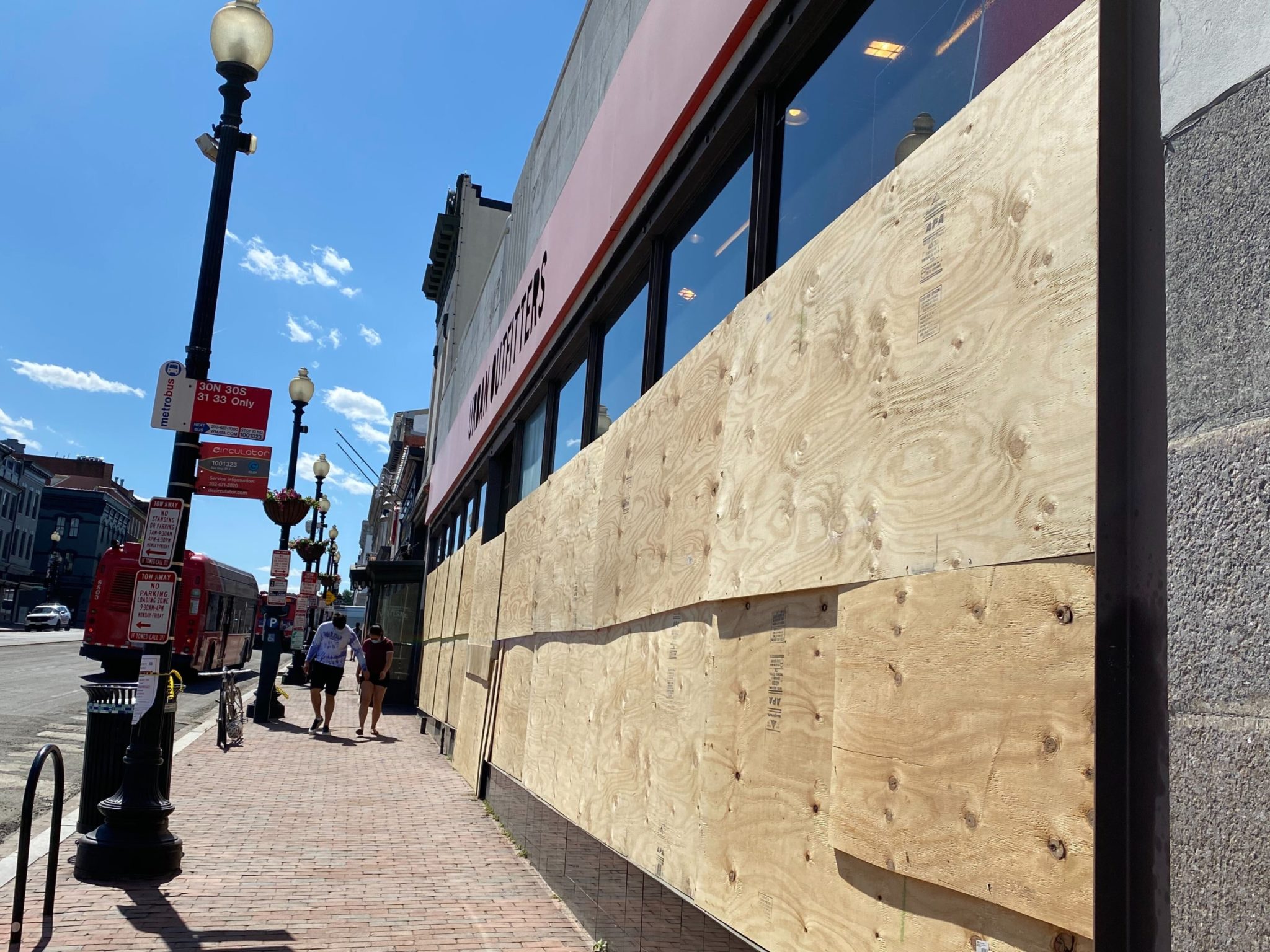 Last night, looters took to many parts of the city, setting small fires and smashing windows. Though DC officials report the majority of the action was downtown, Georgetown businesses were also hit. As of this afternoon, most of the storefronts on Wisconsin Ave. and M Street were boarded up, some out of necessity, others out of precaution. Here are some photos from the area.