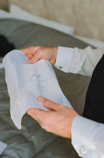 Josh and his groomsmen looked the part in navy suits paired with dusty-rose-patterned bow ties. Josh gifted each of his groomsmen matching socks to wear for a personalized touch.