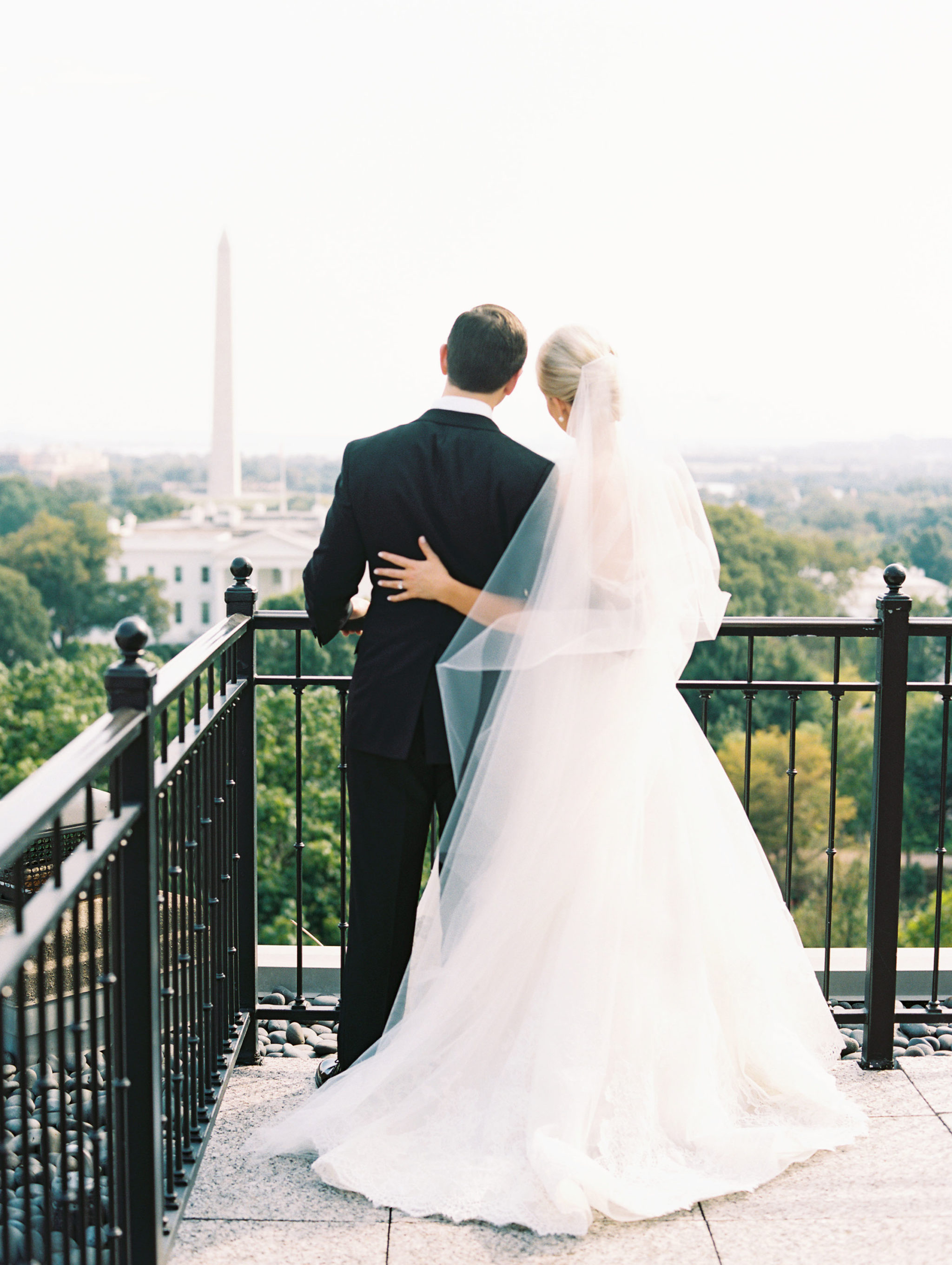 Laura Kastner and Ian Biggs threw a September wedding at the classic and upscale Hay-Adams Hotel. Throughout their big day the couple incorporated a pretty blue-and-white ginger-jar inspired pattern, which was carried throughout from the invitation suite, to the bridesmaids’ getting ready attire, the cocktail hour, place settings, and more. “A collection of white garden roses, dahlias, hydrangeas and maidenhair fern,” says Laura, were used in their floral arrangements and added a tasteful, sophisticated touch to their classic and oh-so elegant aesthetic. Along with their stylish blue and white decor, the couple also took advantage of the Hay-Adam’s rooftop views, which overlook the White House and DC monument, for their first look photos. Check out their full wedding below to see more of their ginger-jar themed celebration and learn more about the couple’s love story.