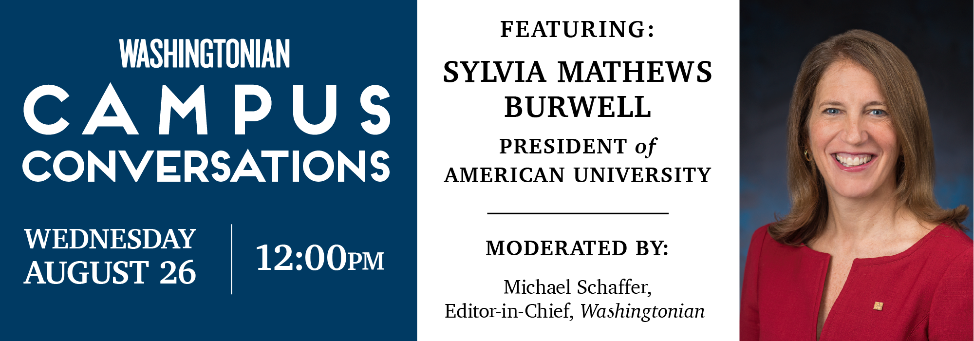 Our next event will feature a one-on-one conversation with Sylvia Burwell, president of American University and Michael Schaffer, editor of Washingtonian. They’ll discuss topics such as President Burwell’s experience as a former Secretary of Health and Human Services, what is top of mind for a college president as faculty, staff, and students prepare to go back to school in a digital-only format, and so much more. Click below to register for this exclusive event and to submit a question for President Burwell.