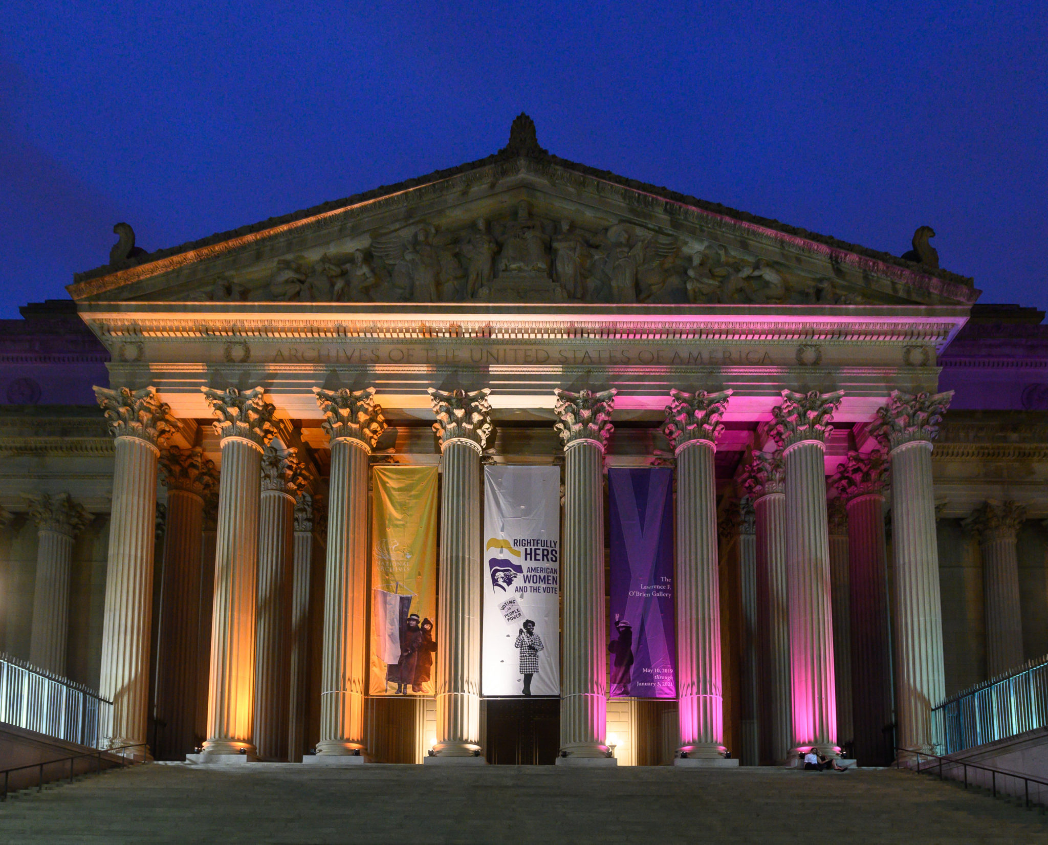 Lights up: Lights of purple and gold, the colors of the suffrage movement, will illuminate the National Archives and other DC institutions on August 26 in honor of the slogan, “Forward Through the Darkness, Into the Light.” Make it a nighttime tour downtown to see purple and gold on the Kennedy Center, the Library of Congress, and the DAR National Headquarters.