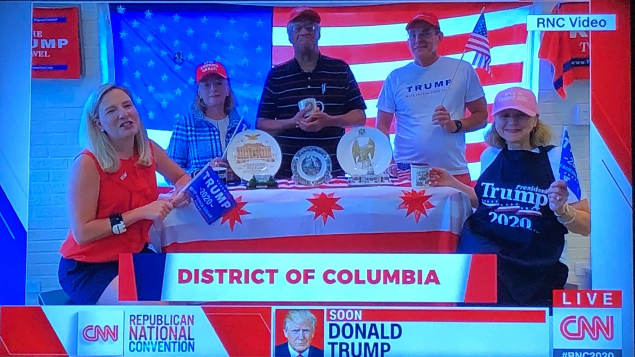 The overall tableau the DC delegation assembled for the telecast is somewhat confusing. The DC flag on the table they surround appears to have been altered so the stars have five extra points. The table is stocked with what appear to be items collected at a gift shop.