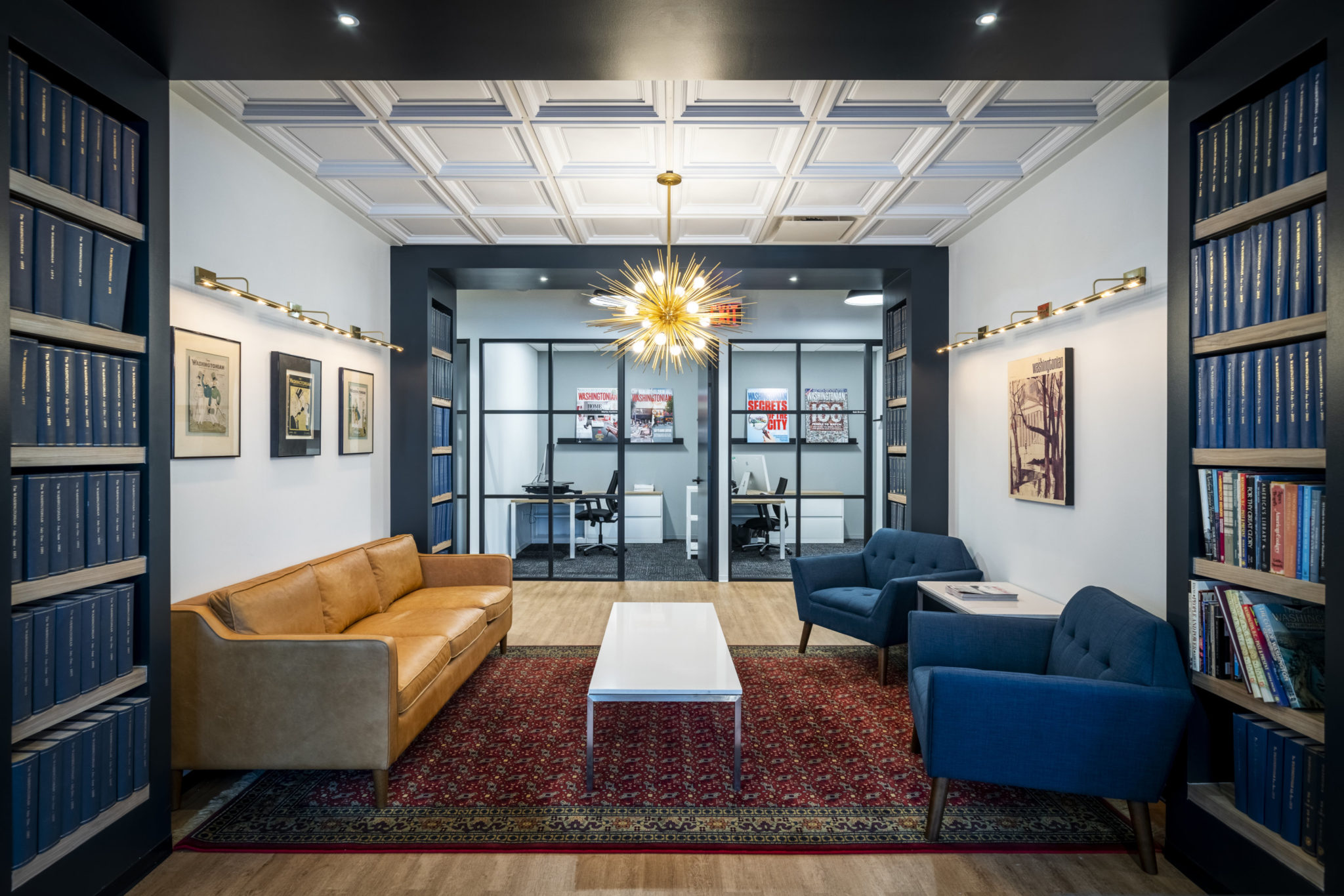 After 44 years in the same downtown building, Washingtonian moved into its new home in June. Our office search had taken us all over the city, but ultimately we wound up just a couple blocks from where we’d started. Our new suite, on the corner of 18th and K, was the perfect blank slate from which to create a more modern, collaborative environment for the magazine’s team. Form Architects spent months designing the loft-inspired space—balancing industrial features such as warehouse-style glass with warmer touches like caramel-hued leather and an antique rug that belonged to our late publisher Philip Merrill. The designers found clever ways to showcase the magazine’s 55-year history, including a feature wall of favorite covers in the reception area. “We wanted to connect visitors and employees to the brand even before entry,” says lead architect Erica Cummings. Rand Construction built out the space, and Dancker and Steelcase helped furnish it.