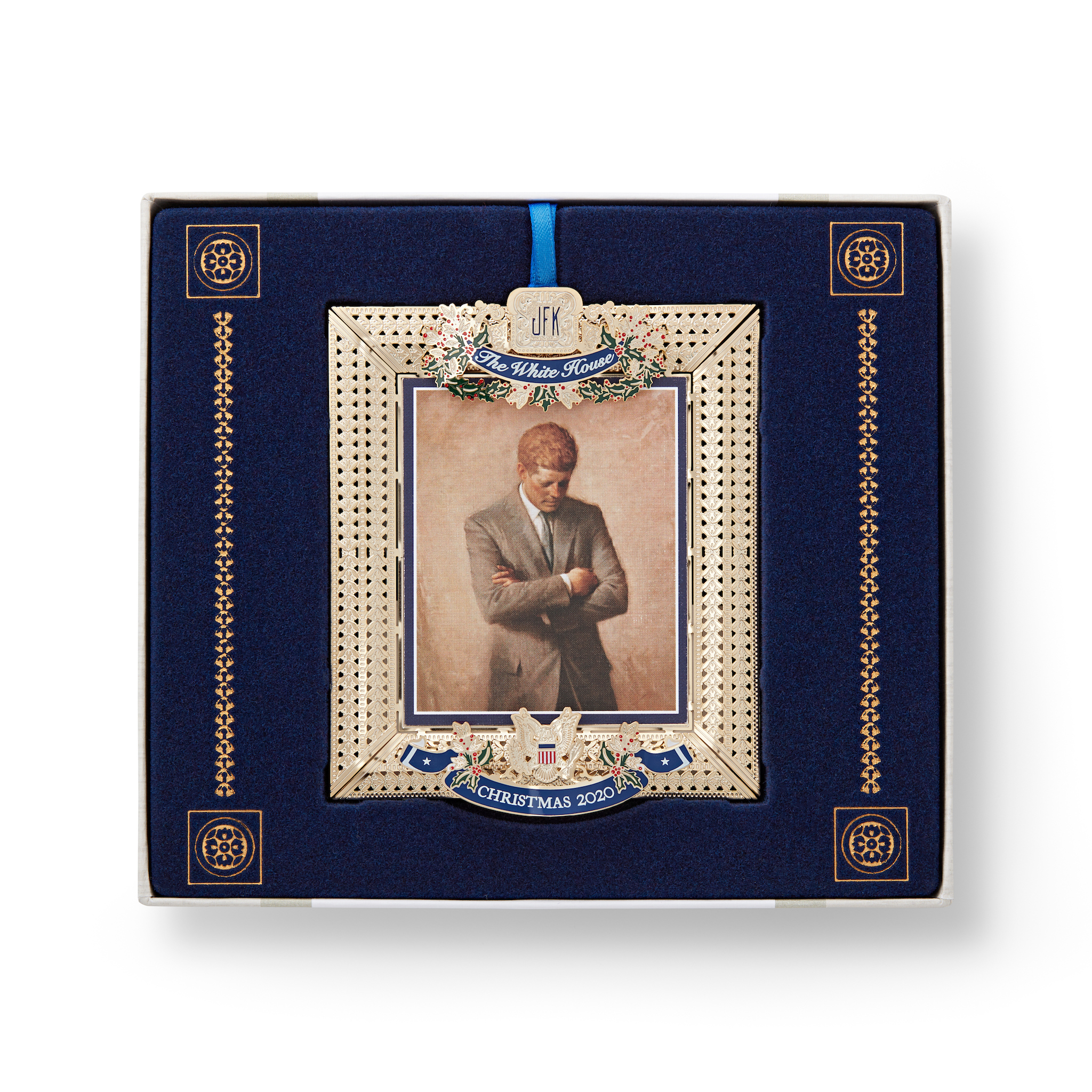 The 2020 White House Christmas ornament features Aaron Shikler’s posthumous painting of John F. Kennedy. The 35th President’s solemn portrait, as befits his interrupted presidency, was unlike those of his predecessors—Shikler said in 1981 that it “stands out among all those God-forsaken postage-stamp portraits hanging in the White House.” The ornament will hang on the White House Christmas tree.
