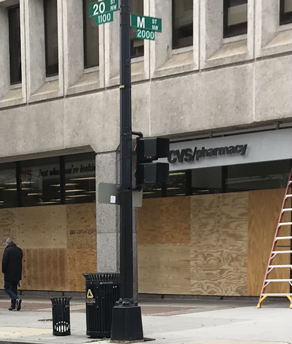 Amid all the spectacles of the years since 2016, the sight of a downtown DC chain pharmacy putting boards over its storefront on a quiet late-October afternoon does not seem particularly grotesque.