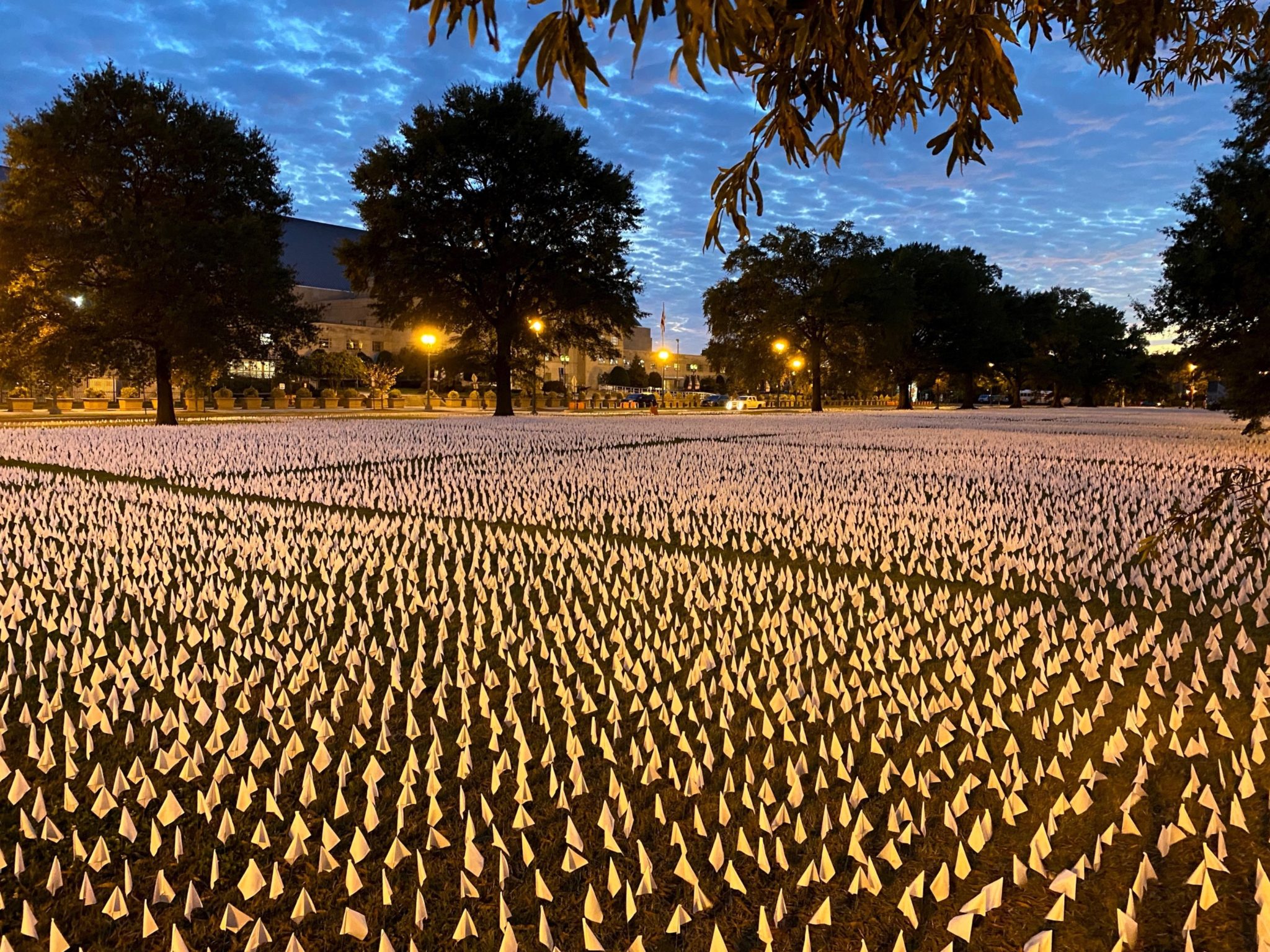 Around 228,000 flags now flutter in memory of the lives lost to Covid at Washington artist Suzanne Brennan Firstenberg’s installation “In America How Could This Happen…” and between now and the end of the project next week, the evolving memorial needs visitors to plant thousands more pennants to match the ever-rising death toll.