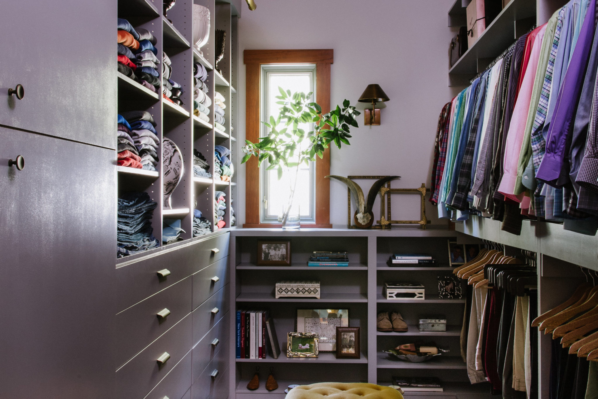 Interior designer Elizabeth Reich of Jenkins Baer Associates created this moody space for a couple in Baltimore, using their existing closet, plus a small room next door that lacked purpose. She incorporated a vintage ottoman, picture lighting, and an eggplant area rug for a cozy aesthetic.