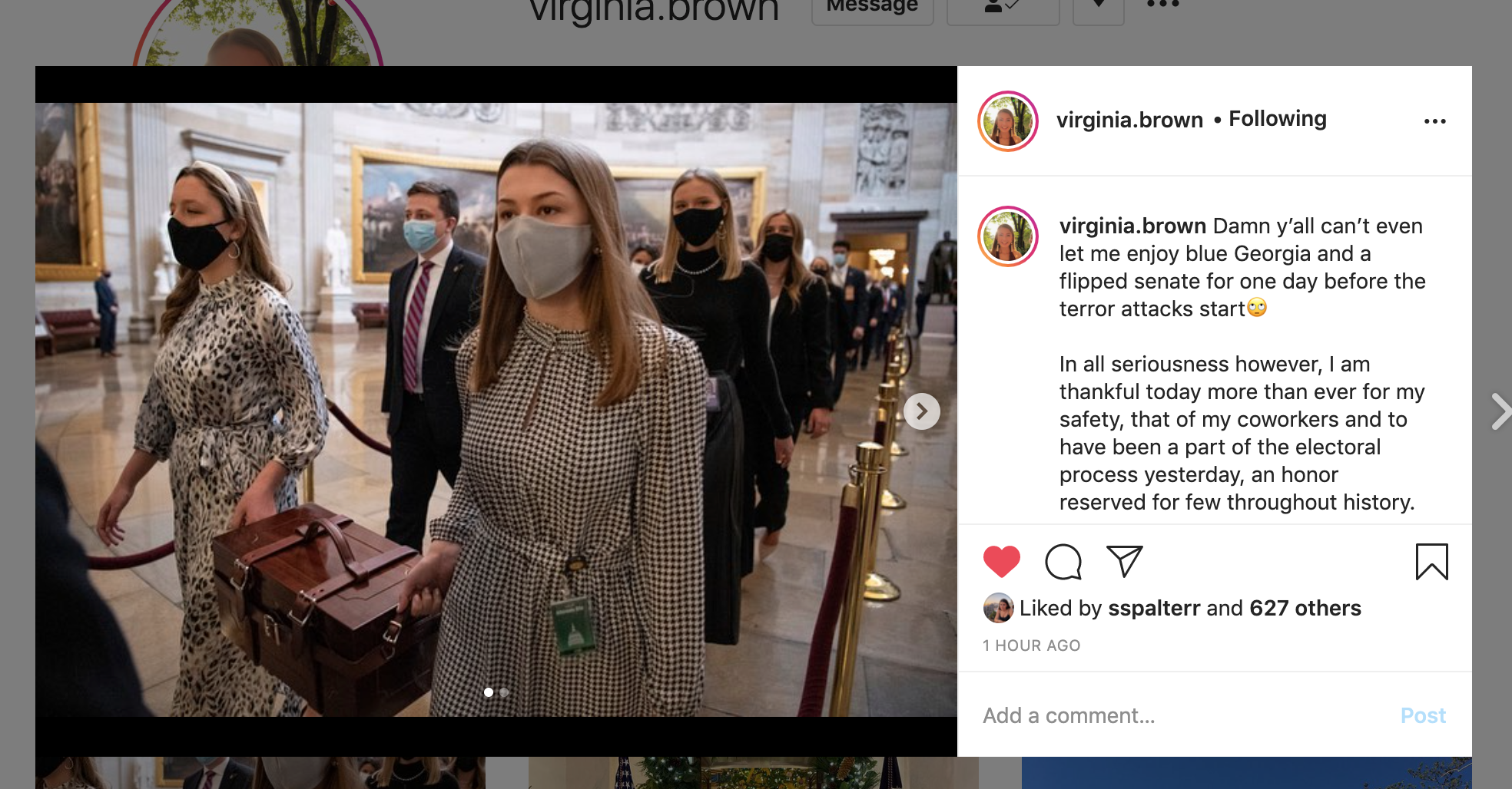 One of the women in that photo is Virginia Brown, a 19-year-old chamber assistant who works for the Democratic Cloakroom. The image, it turned out, was from earlier in the day when she and other staffers were transporting the boxes of votes to be certified. In a post on her personal Instagram account, Brown clarified: “I think a well-meaning member of the media made the connection between the pictures of us carrying boxes and us being the ones to save them, and it spread quickly, but credit goes out to the ones who actually did risk their own safety for all of us.”