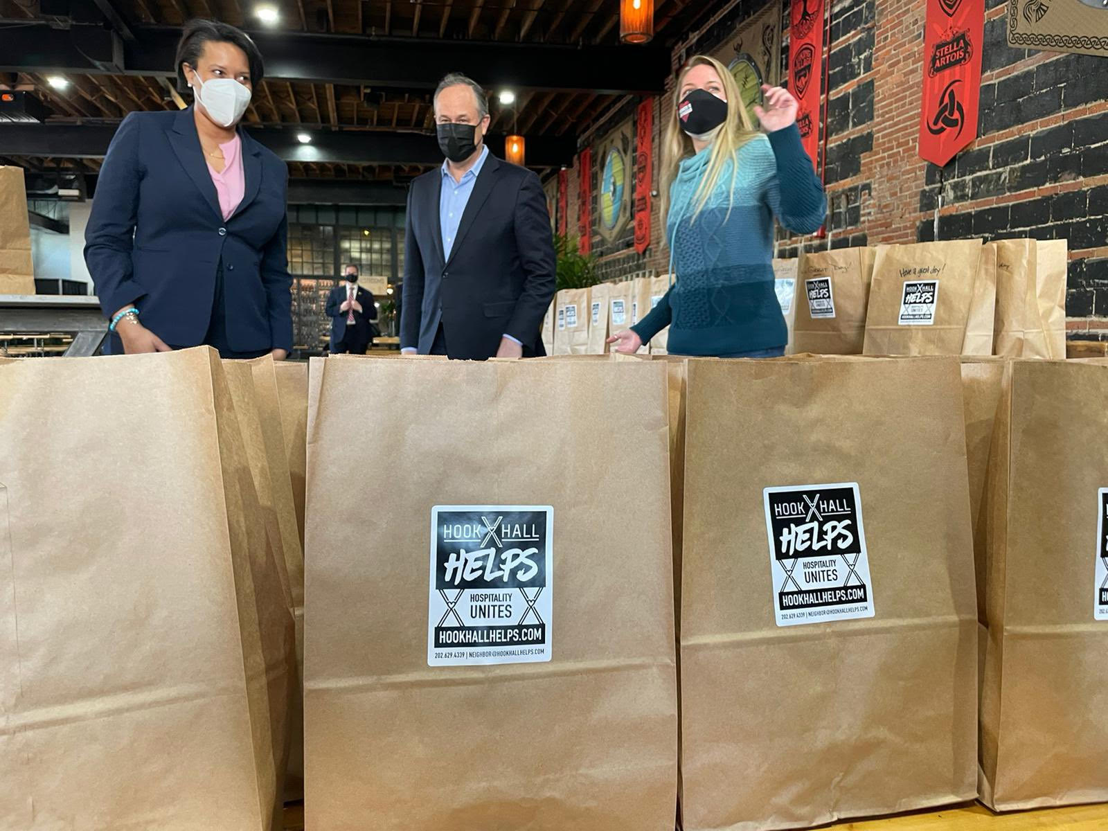 Emhoff also toured the relief operation during his hour-long visit. Hook Hall Helps initially launched in March after bars and restaurants were forced to close, and huge numbers of industry employees found themselves suddenly out of work. Pre-Covid, the District’s hospitality industry employed more than 63,000 people. Valero and a small team of volunteers worked with restaurant supply companies to get toilet paper and cleaning products to workers, and coordinated with chefs to make meals and gather food donations. They teamed up with the Restaurant Association Metropolitan Washington to launch a citywide Worker Relief Fund, which has raised more than $850,000 to aid the effort.