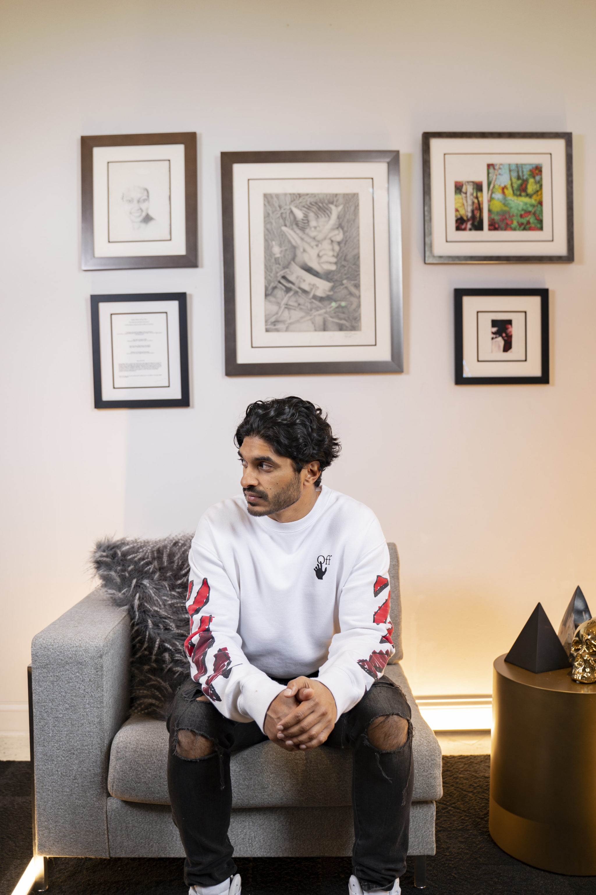Basnayake—who is a partner at the law firm Nelson Mullins and the founder of Versus Equity, a private equity/consulting/management firm with a portfolio that includes local hospitality and lifestyle businesses—says he was “immediately drawn to the piece that looks sort of like a chained centaur.” Even, he claims, before he knew it had been created by Kanye West. “There was something about it that I felt a strong connection to,” Basnayake says. “The minute I heard it was by Kanye—one of my favorite artists of all time—I knew I had to have it.”