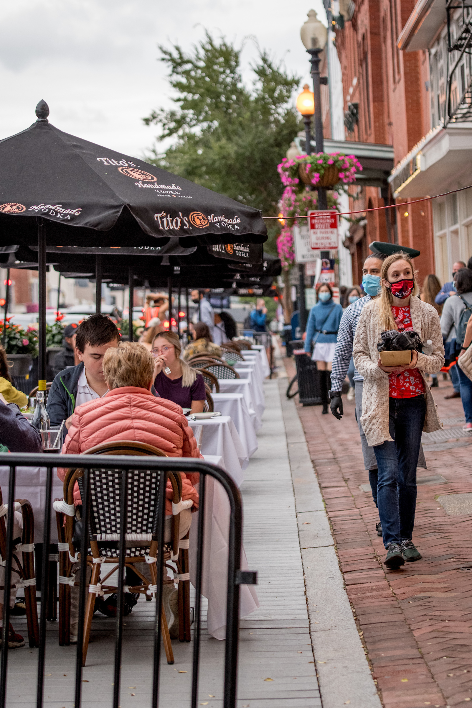 The $1.3 million project will bump out Georgetown’s sidewalks from an average width of nine-and-a-half feet to an average of 15 feet and will provide more room for outdoor dining and social distancing. The removable panels will be wheelchair- and stroller-accessible, and have space underneath for storm water to flow. Three extensions are already in place outside of Clyde’s, L’Annexe, and Thunder Burger. Once fully completed in May, there will be panels on M Street NW between 34th and 29th streets NW, and on Wisconsin Avenue NW between Q Street NW and the canal.
