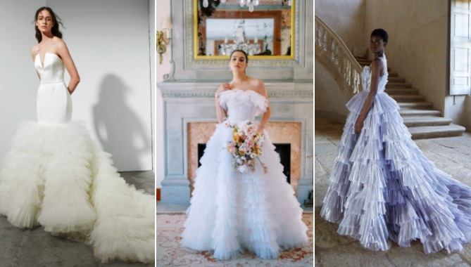 While we weren’t able to see the unveiling of all the new collections from New York Bridal Fashion Week up close and personal this season, the gorgeous designs were still evident even through our computer screens. The Spring 2022 season of New York Bridal Fashion Week went on virtually again this year, due to the pandemic. However, though in-person attendance was limited or non-existent for safety precautions, bridal designers did not disappoint, delivering captivating gowns for future brides-to-be. We’re prepping our trend forecast for our summer print issue, but in the meantime, we’ve rounded up dresses with one element that will be taking the ceremony aisles by storm in 2022: romantic ruffles. A variety of swoon-worthy gowns were covered in fluttery tiered fabric, from silk taffeta to organza tulle, and we can’t wait to see them in action when more celebrations make their return in the DMV. Check out a few of our favorite romantic ruffle wedding dresses below to see what we mean.