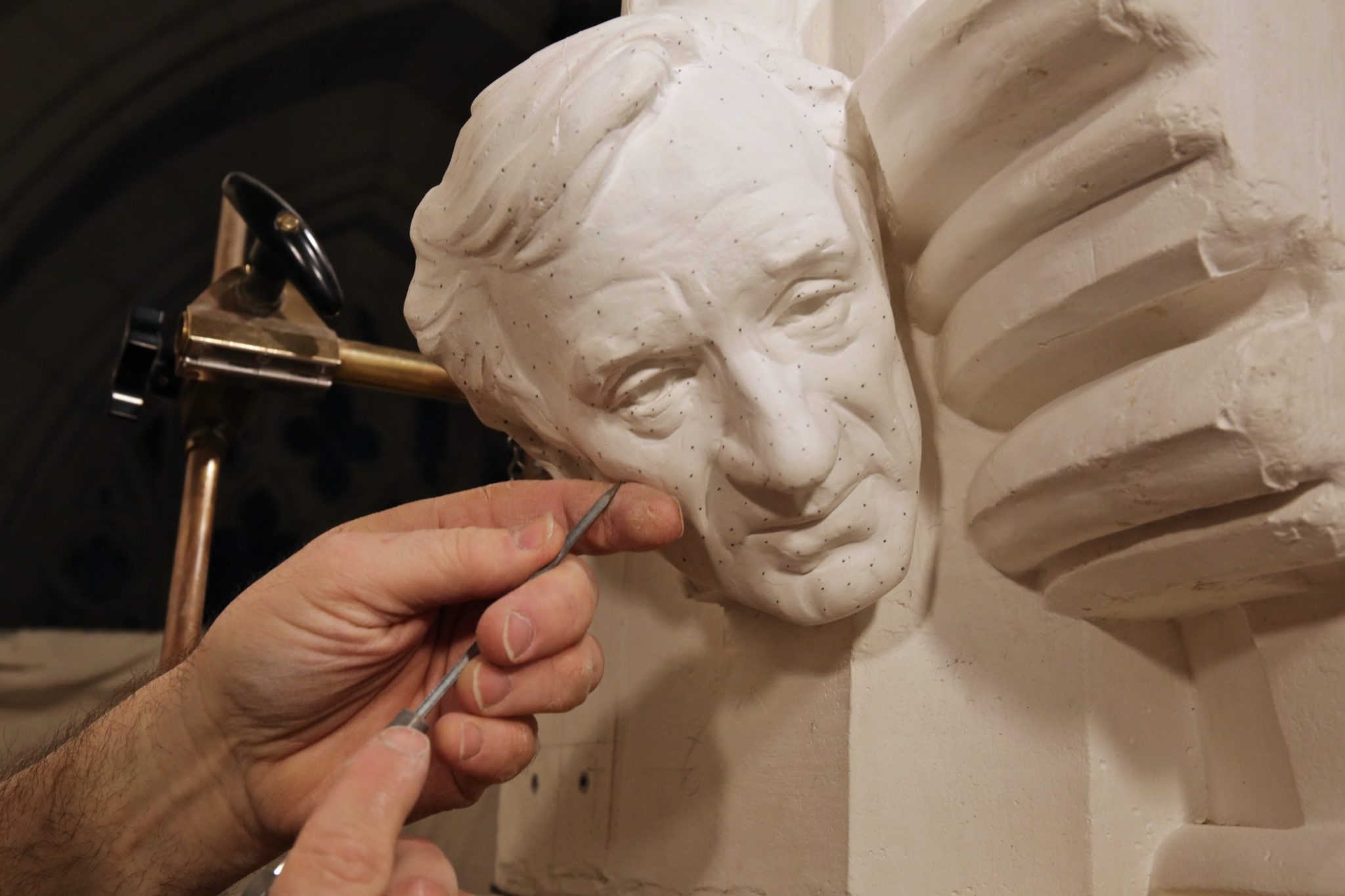 The sculptor, Chas Fagan, is a longtime partner of the cathedral who is skilled at creating lifelike work in the cathedral’s style. Working with the family, Fagan starts with a clay model that captures the subject’s countenance and expression. Once that’s approved, the job gets passed on to the resident stone carver, Sean Callahan, who creates the bust out of Indiana limestone. (Callahan also created the plaque for Matthew Shepard in 2019.) As the pandemic has kept the cathedral closed to its usual crowds, the actual carving process was shortened to just two months.