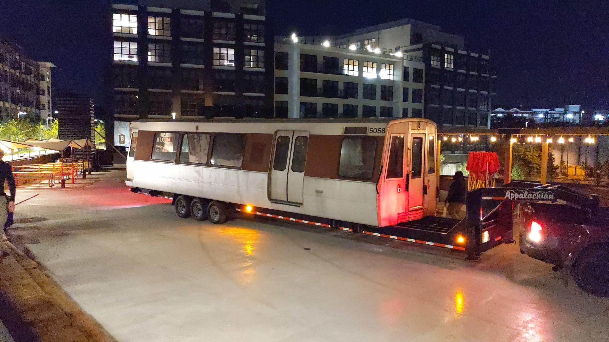 After midnight last Thursday, a series 5000 Metro train—cut in half and mounted on two trailers—was hauled by pickup trucks from a lot outside Baltimore to a new home near the Rhode Island Ave-Brentwood station. In the coming weeks, the permanently parked car will be retrofitted with a bar and dining tables as the showpiece of Metrobar, a new eating and drinking venue with massive outdoor patio.