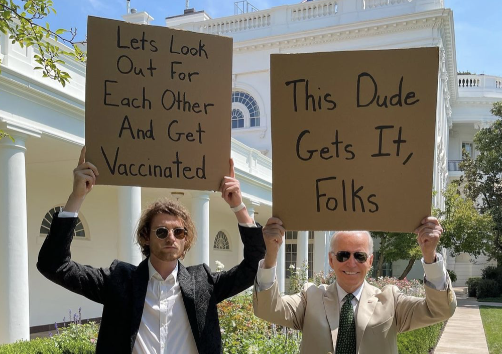 To encourage young people to get the Covid vaccine, the Biden administration has recently been inviting various internet celebs and pop stars to the White House: singer Olivia Rodrigo, TikTok star Benny Drama, and, most recently, “Dude With Sign,” a man with 7.5 million Instagram followers who often goes viral for—as his name suggests—holding up a cardboard sign with different things written on it. This may be his most important message so far (despite his apparently shaky grasp of contractions): “Lets Look Out For Each Other And Get Vaccinated.” In a widely circulated photo, the Dude is seen next to President Biden, who is dressed for the occasion in his aviators and tan suit. POTUS has a sign of his own: “This Dude Gets It, Folks.”