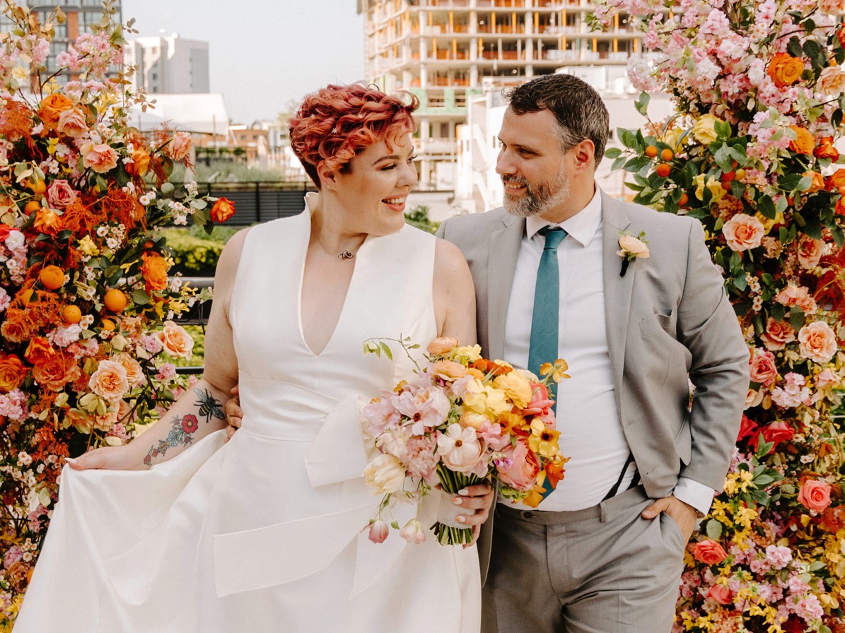 Caitlin and Bart’s September 1, 2019 wedding at Dock 5 at Union Market included 200 guests and a “DC-inspired dance party” theme with lots of nods to Union Market, and an “eclectic, modern-rustic” aesthetic, featuring lush greenery and jewel tones along with geometric wood tones and copper accents. See below for the details of their big day.