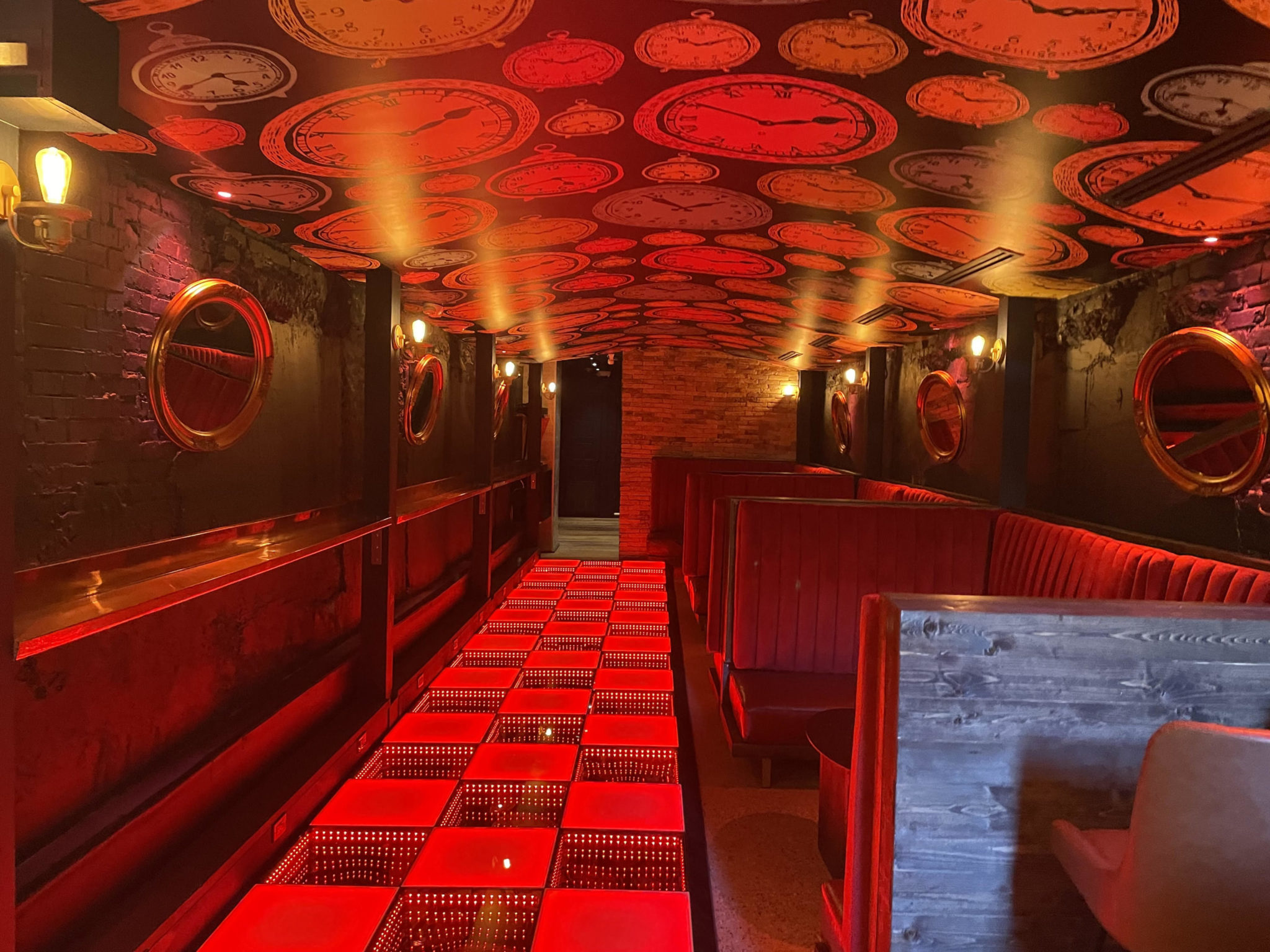 The 30-seat lounge with red banquettes and a bar features infinity mirror floors—”the same as the mirrors they sell Lamborghinis on,” Saund says. The ceiling is covered in images of watch faces. “Dino’s a watch guy. He loves the Rolexes,” Snyder explains. (He also has his own military watch collection.)