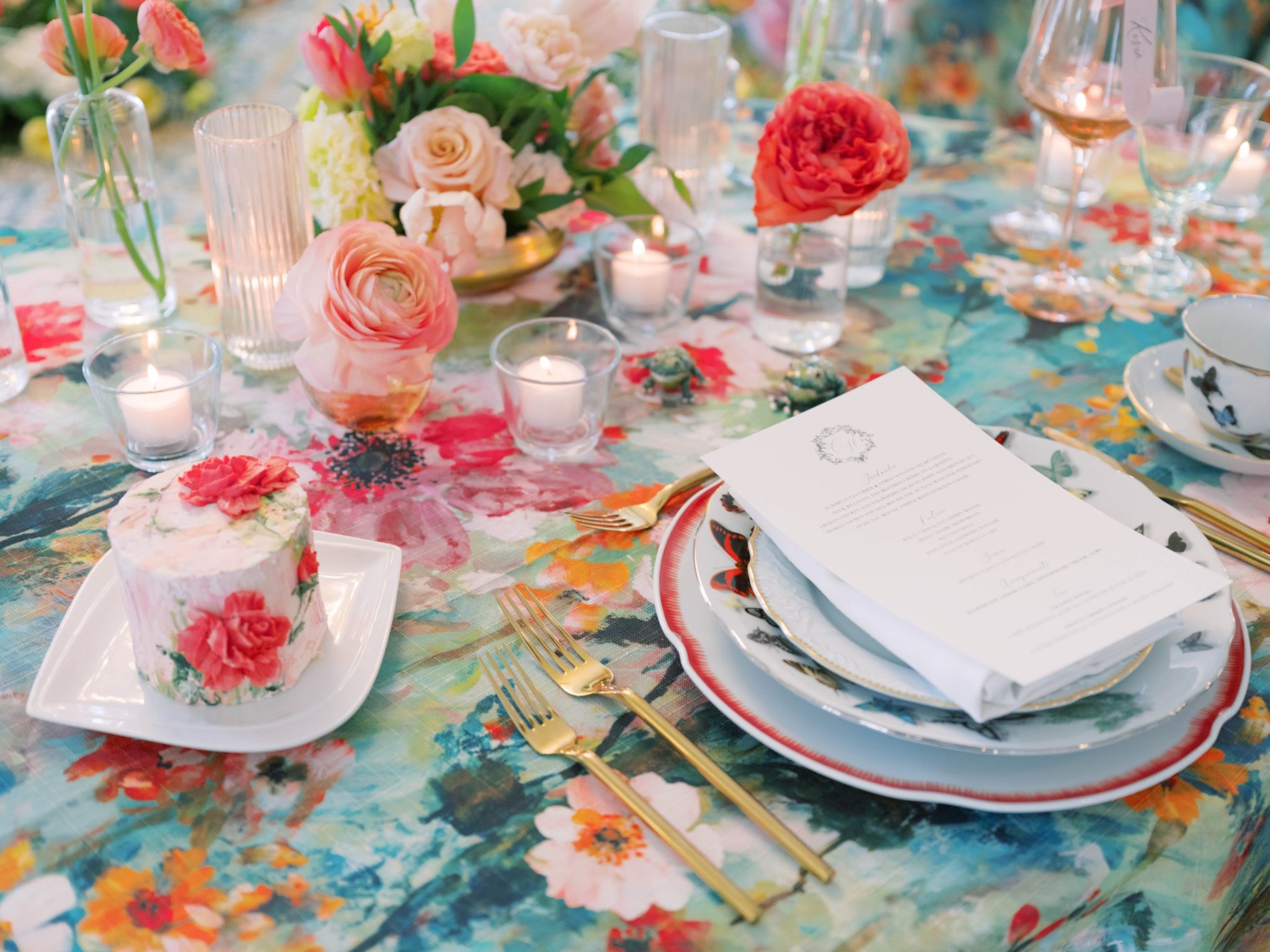 Once they selected their 4-3-21 date, they planned a ceremony and afternoon tea at the Willard for seven. The Impressionist aesthetic of their “secret garden” party included watercolor tablecloths, frog-shaped salt and pepper shakers, butterfly-adorned plates, a Monet-inspired cake, and vibrant florals. Guests enjoyed sandwiches, scones, and pastries from the hotel’s afternoon-tea menu plus a few à la carte selections from its brunch service. The couple chose a three-tier almond cake with mocha buttercream, dark-chocolate ganache, and cacao nibs, as well as mini vanilla-butter cakes with lemon curd, strawberry jam, and strawberry buttercream, which doubled as favors.