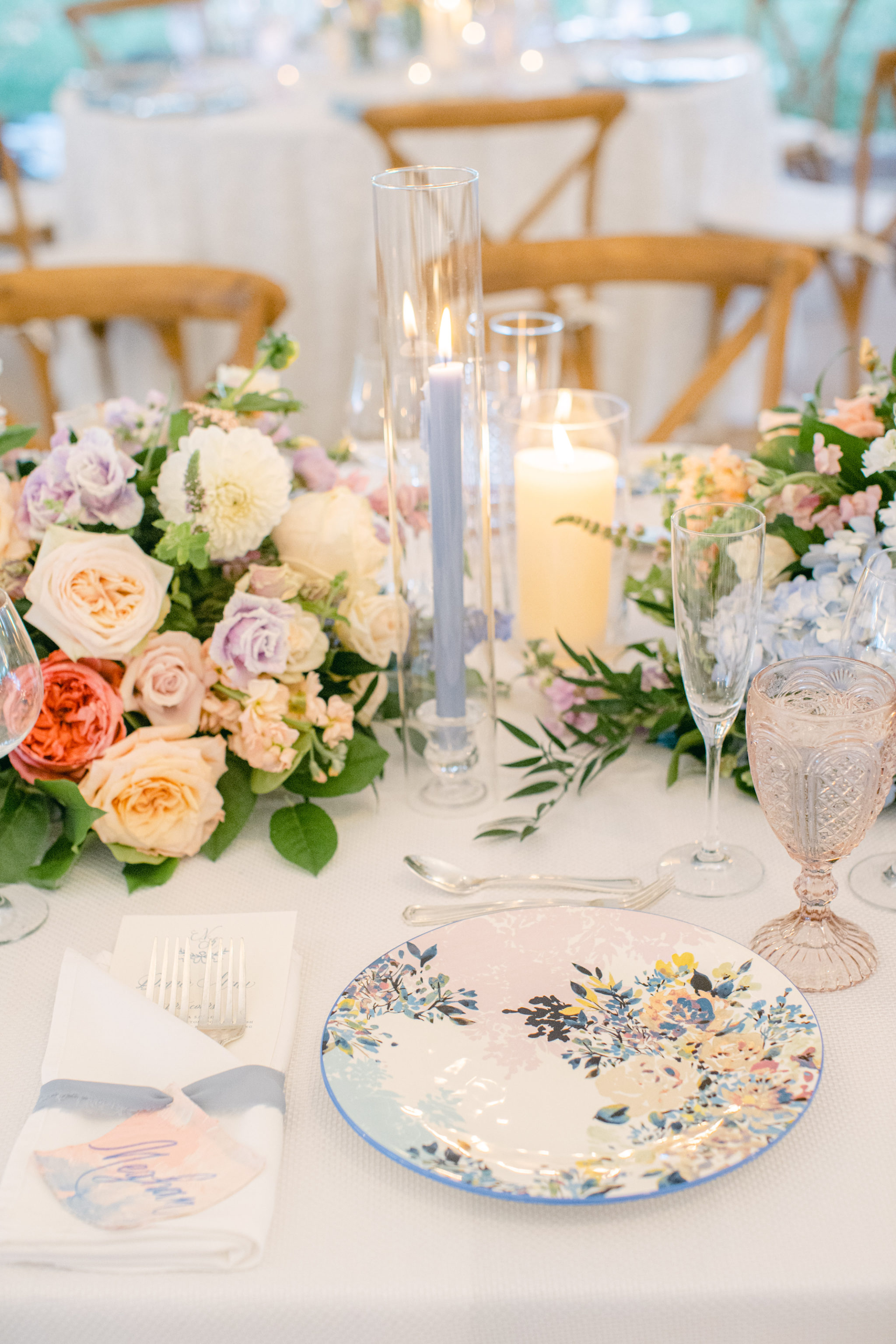 This garden-party place setting was inspired by the floral base plate and sourced from four vendors (Capital Rentals, White Glove Rentals, Lindale Studios, and Pretty Mail Calligraphy), says Anne Kelley of Anne Kelley Events: “We loved coming up with the layers”—including the napkins, glassware, and flatware, plus the hand-painted place cards with calligraphy—“to make it colorful and interesting.” Total cost: $27 per guest.