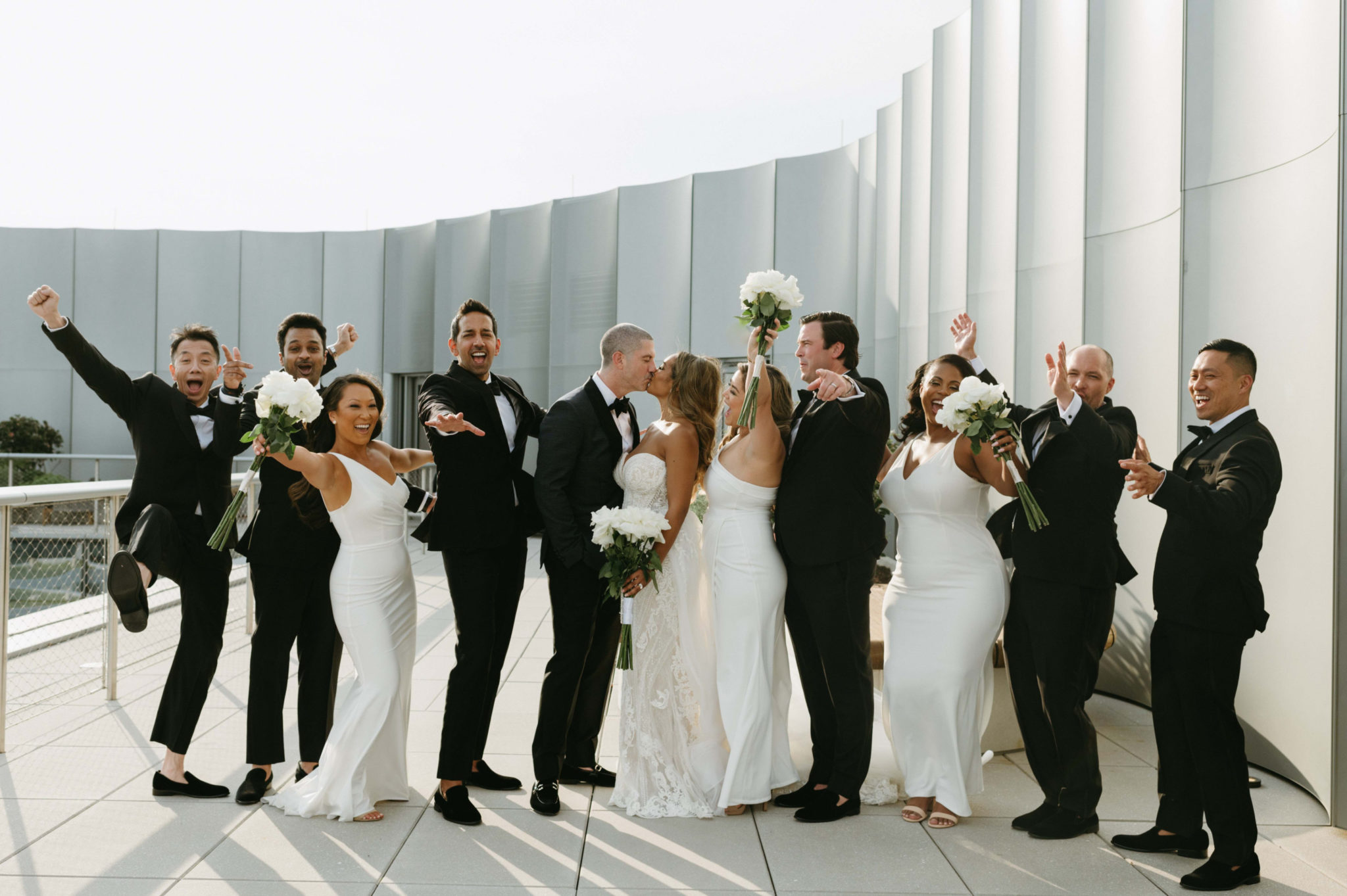 Instead of a first look, the pair did a “first touch,” where they exchanged gifts and notes back-to-back in the hotel’s courtyard after getting ready. Back inside, the couple wanted a “glam, chic, minimalist” aesthetic, using a color palette of white, silver, and nude hues, with white roses all around.