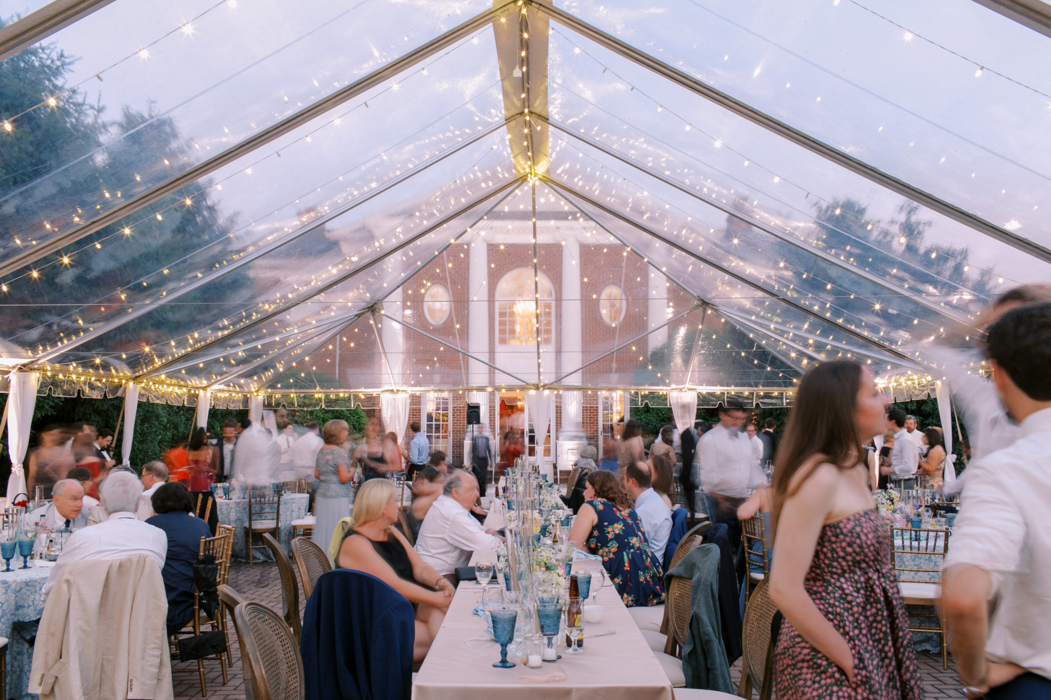 “Three months before our wedding, we had to reimagine everything. We found a venue with plenty of outdoor space in Virginia that would let us safely celebrate with our larger guest count. We quickly moved all of our vendors over to the new venue and shifted from a museum wedding to an outdoor tented wedding,” the couple says. The couple required that guests be vaccinated or get tested beforehand, and gave guests corresponding bracelets.