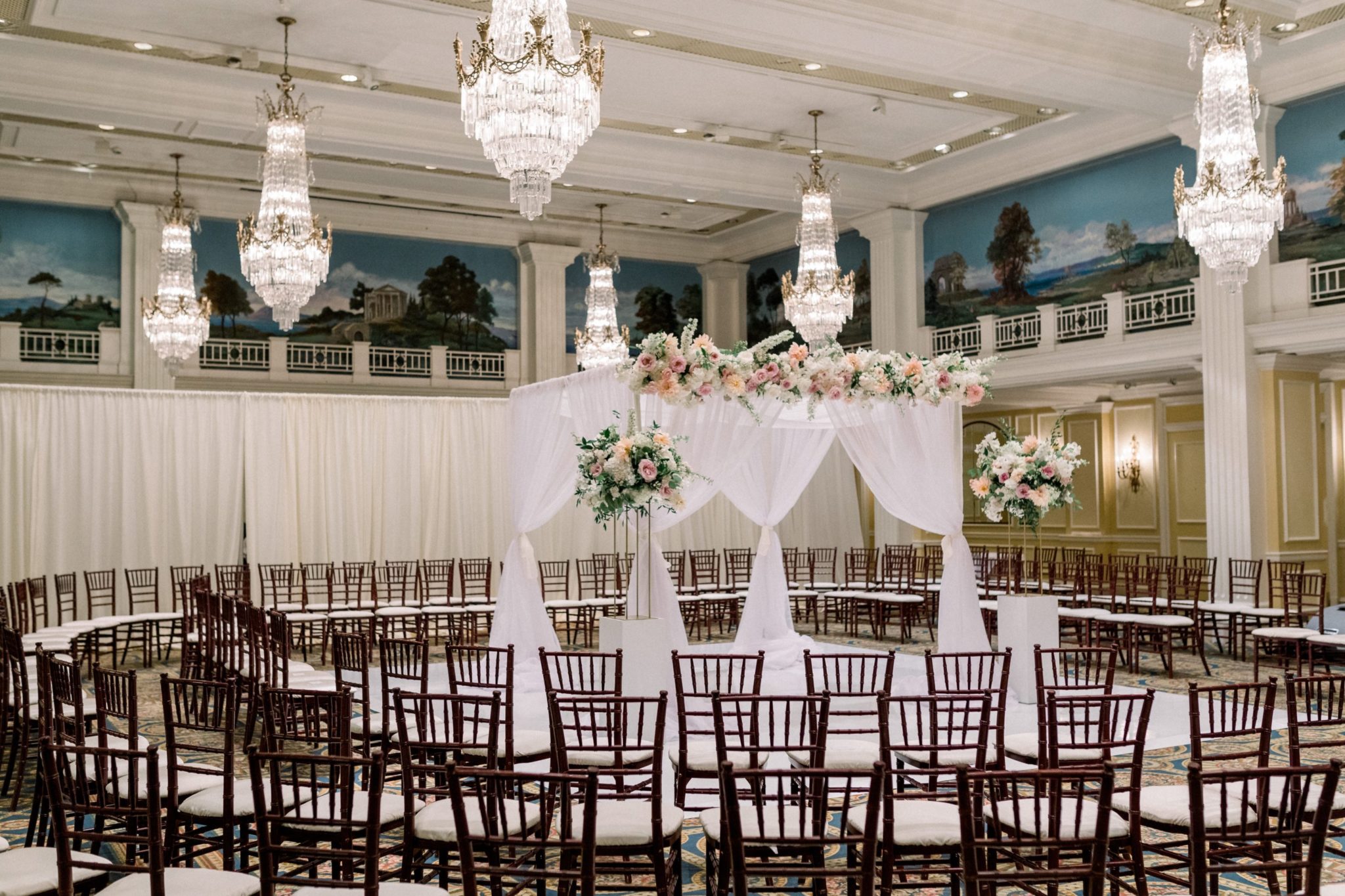 For the design, they wanted classic decor in white, cream, and dusty rose for the wedding, followed by a speakeasy vibe for the afterparty.