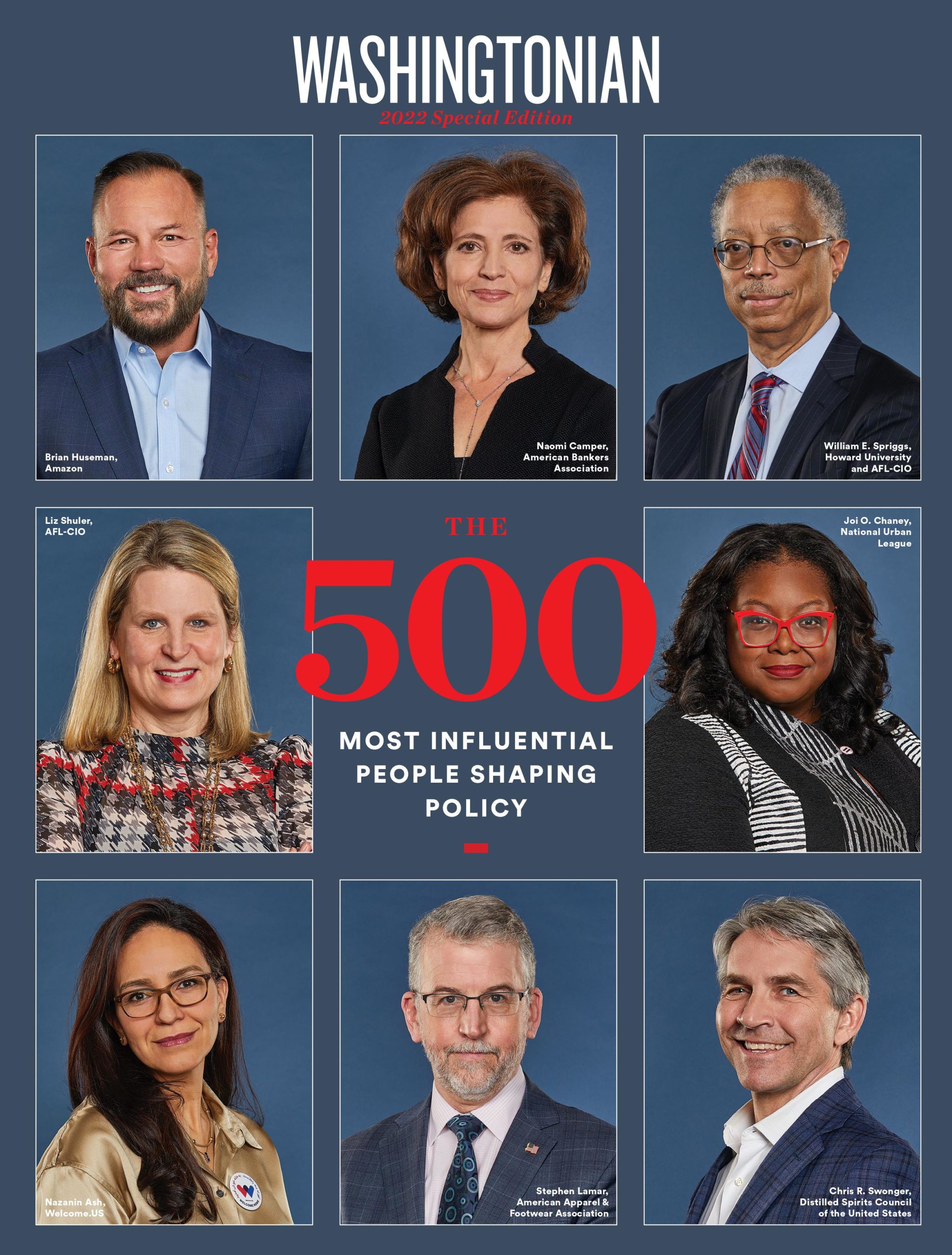 Andrés by Josh Telles; Andrews courtesy of Intel; Bahn by Sheena Ozzella; Bandla courtesy of Virgin Galactic; Booren courtesy of Consumer Brands Association; Bradley courtesy of U.S. Chamber of Commerce; Brown courtesy of USW Photo; Buth courtesy of NCAA; Ciccone courtesy of Toyota; Clark courtesy of U.S. Chamber of Commerce; Dodge courtesy of RILA; Dow courtesy of U.S. Travel Association; Duvall courtesy of AFBF; Harris by Ian Wagreich; Kelley by Keith Mellnick Photography; Kelly courtesy of IAFF; McGreevy by Tom Williams; Nabavi by Bill Clark; Newhouse courtesy of National Association of Manufacturers; Rivkin by Gary Landsman; Rogers courtesy of AHLA; Samuel courtesy of AFL-CIO; Shuler courtesy of AFL-CIO; Timmons courtesy of National Association of Manufacturers; Tippens by Chelsea Bland/AFGE; Yaekel courtesy of NGA