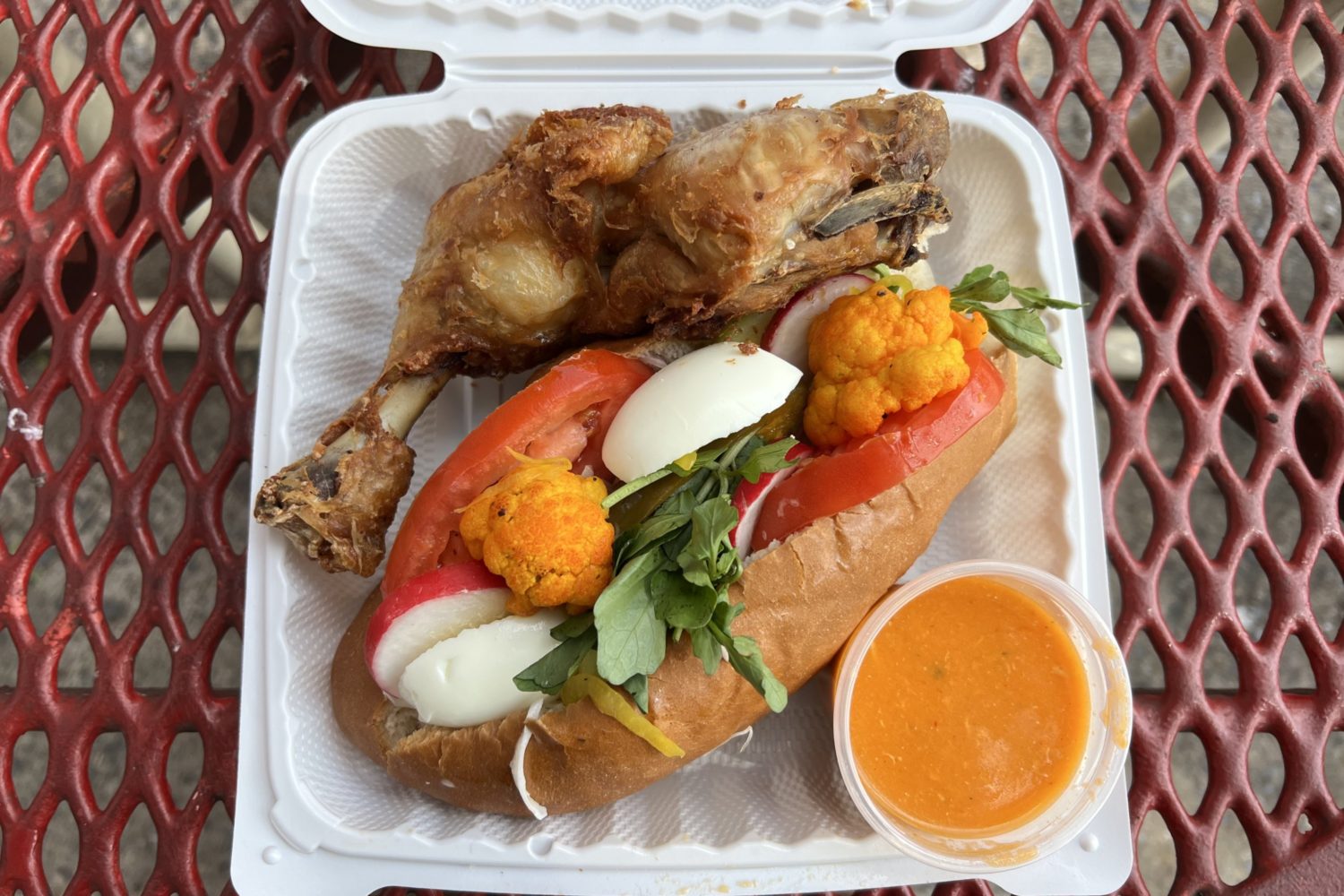 The South American chicken joint, which boasts a secret bar in the back and curbside window up front, offers a jumbo-sized sandwich: cassava-breaded chicken on a jalapeño-cheddar roll with spicy ají amarillo mayonnaise, tomato, iceberg lettuce, Greek yogurt-mustard sauce, crispy bacon, and pepperjack cheese.