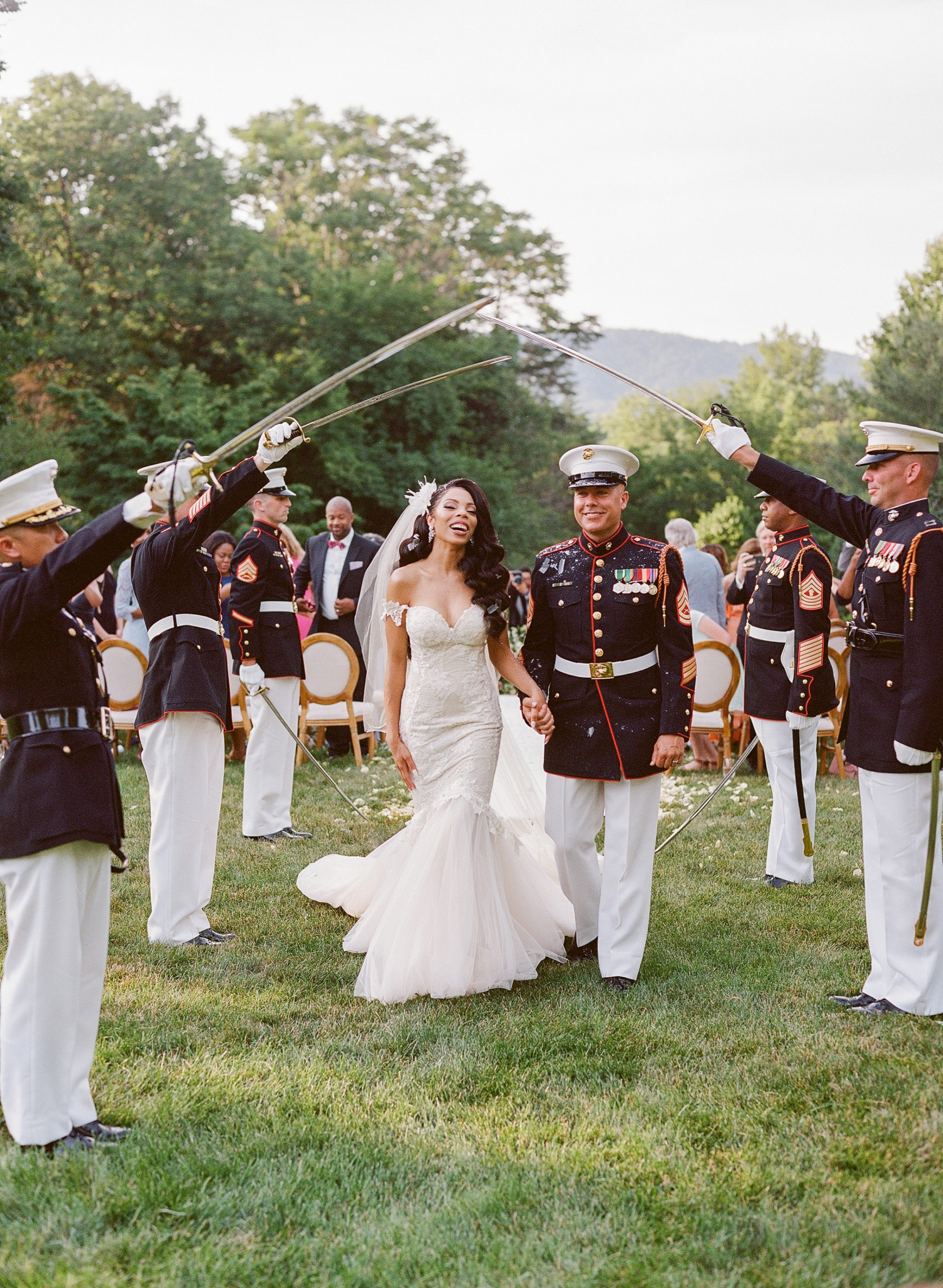 First connecting on Tinder, Echoe, a Howard University med student and Army second lieutenant from Los Angeles, and Shawn, a ceremonial musician for the US Marine Drum and Bugle Corps from Verona, Virginia, got engaged three years later on the Capitol grounds. They had to call off their Amalfi Coast destination wedding and instead planned “elegant and sexy” Virginia nuptials that included 44 guests. The ceremony was punctuated by confetti poppers at the kiss and featured a saber arch; at cocktail hour, synchronized swimmers put on a surprise performance. Friends and family—at a single long, candlelit table—were attended by servers in white uniforms and chose lamb, New York strip, or trout as a main course. The bride arranged for a white rose to be placed on a chair in honor of Shawn’s mother, who’d passed away a year earlier. Guests took home peaches jarred by the couple and the groom’s dad.