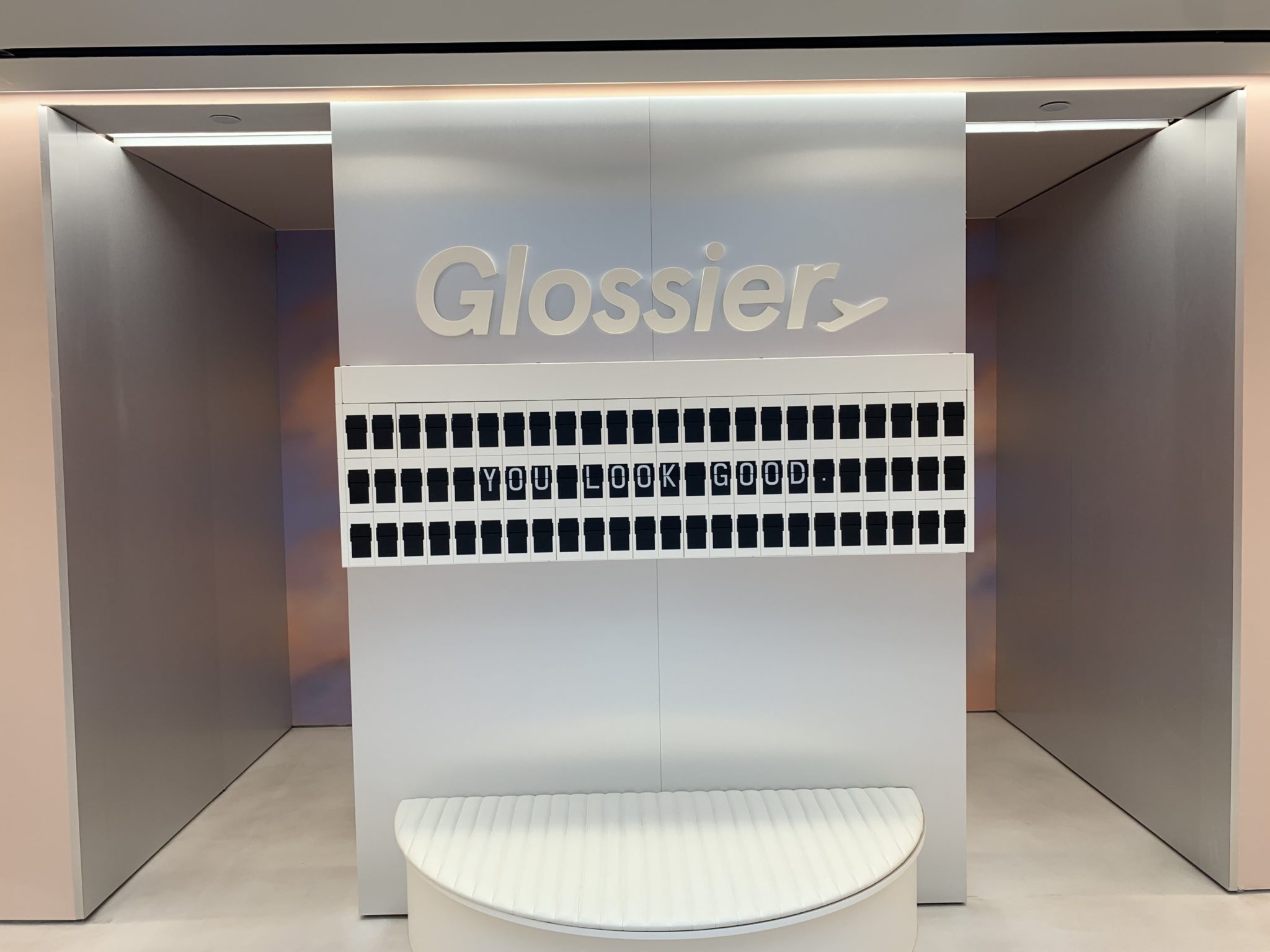 There are “retro-inspired” arrivals and departure signs, seating inspired by airplane wings and jet seats, and runway-esque lighting. And of course: a signature Glossier selfie room. This one designed to look like an airplane window with clouds passing by.