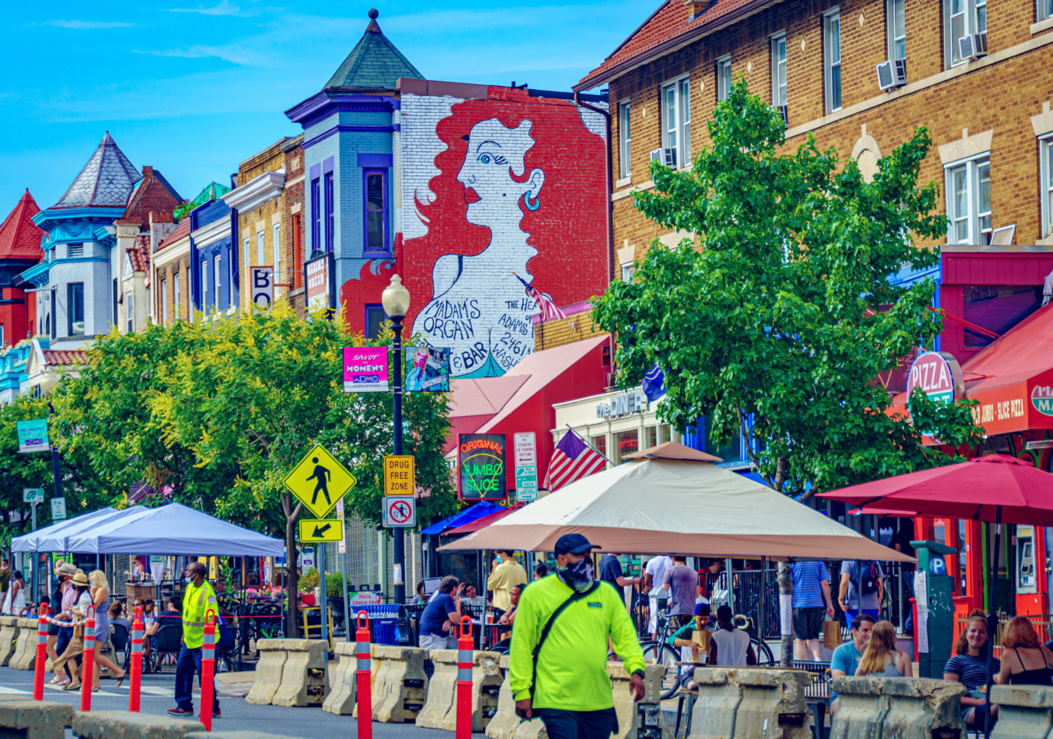 “The objective of the pedestrian zones is to provide economic recovery for all of the businesses in Adams Morgan,” Kristen Barden, Executive Director of the Adams Morgan Partnership BID, tells Washingtonian in an email. “Closing the street to vehicular traffic allows for more pedestrians, bicycles and scooters and creates a safe space for people to dine, shop, and explore the neighborhood offerings.”