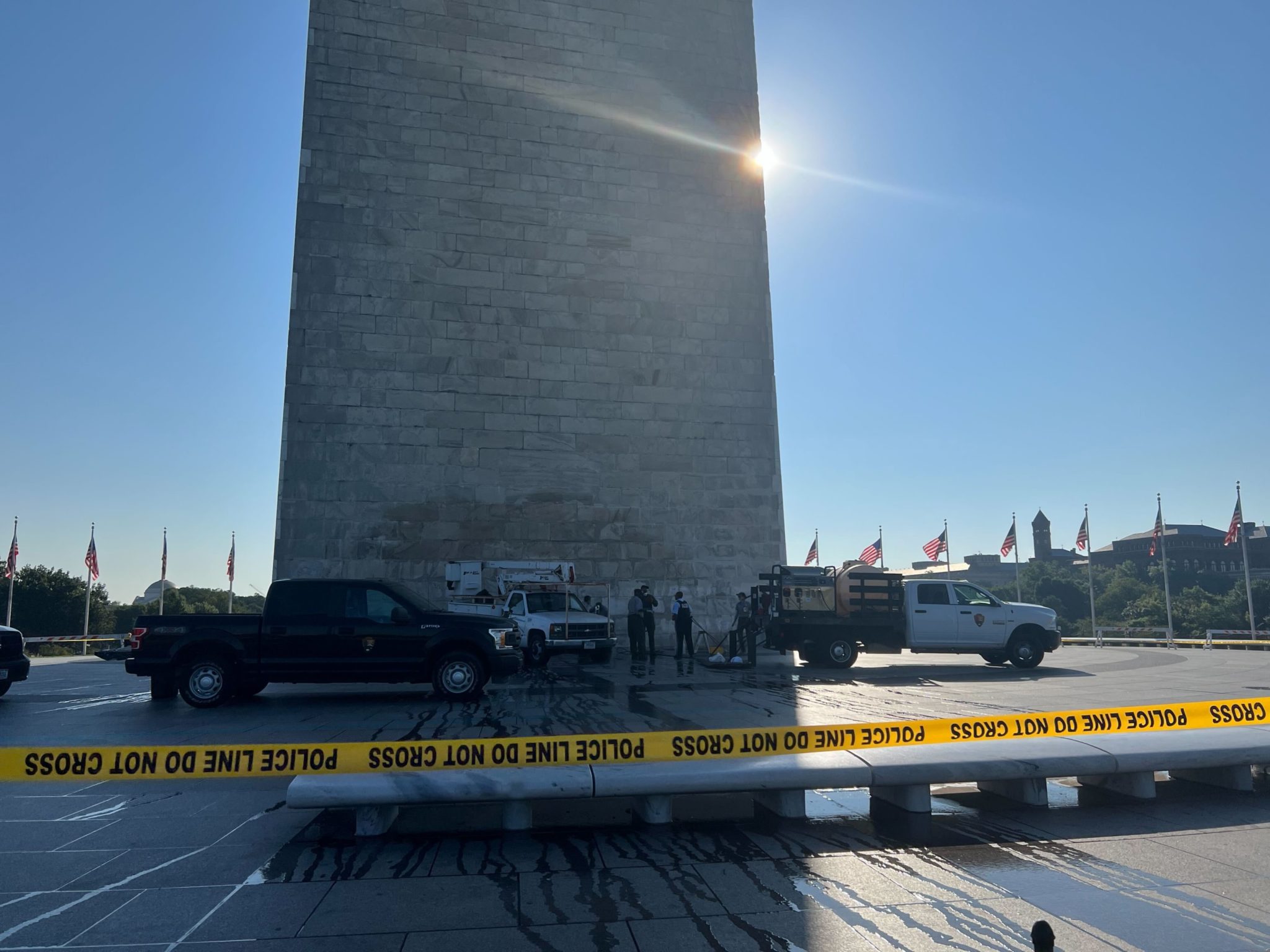The cleanup effort is already underway. Mike Litterst, a spokesperson for the National Parks Service, told Washingtonian that a team of NPS’ in-house conservators came out at 5 AM on Wednesday morning to begin the removal process. This isn’t the first time the team of stone and marble preservation pros have worked with paint: They employed the same strategies when the Lincoln Monument was splashed with light green coloring in 2013. The team will conduct a series of paint remover treatments over the next few days until the job is done.