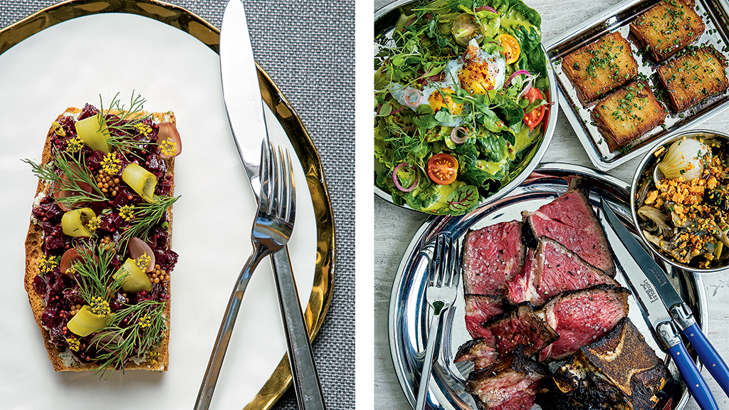 Count Ryan Ratino’s modern brass-and-blue bistro among the many restaurants to have traded à la carte offerings for prix fixe. Order a stellar cocktail such as the shochu-andpassionfruit-driven Garden in Giverny; choose among a three-, four-, and six-course menu; and dabble in dishes such as a fabulous carrot cappelletti with lamb neck, a brioche-stuffed chicken, or the chef’s famed duck à la presse with braised cabbage. Meatier fare has been better than the seafood lately. Expensive.