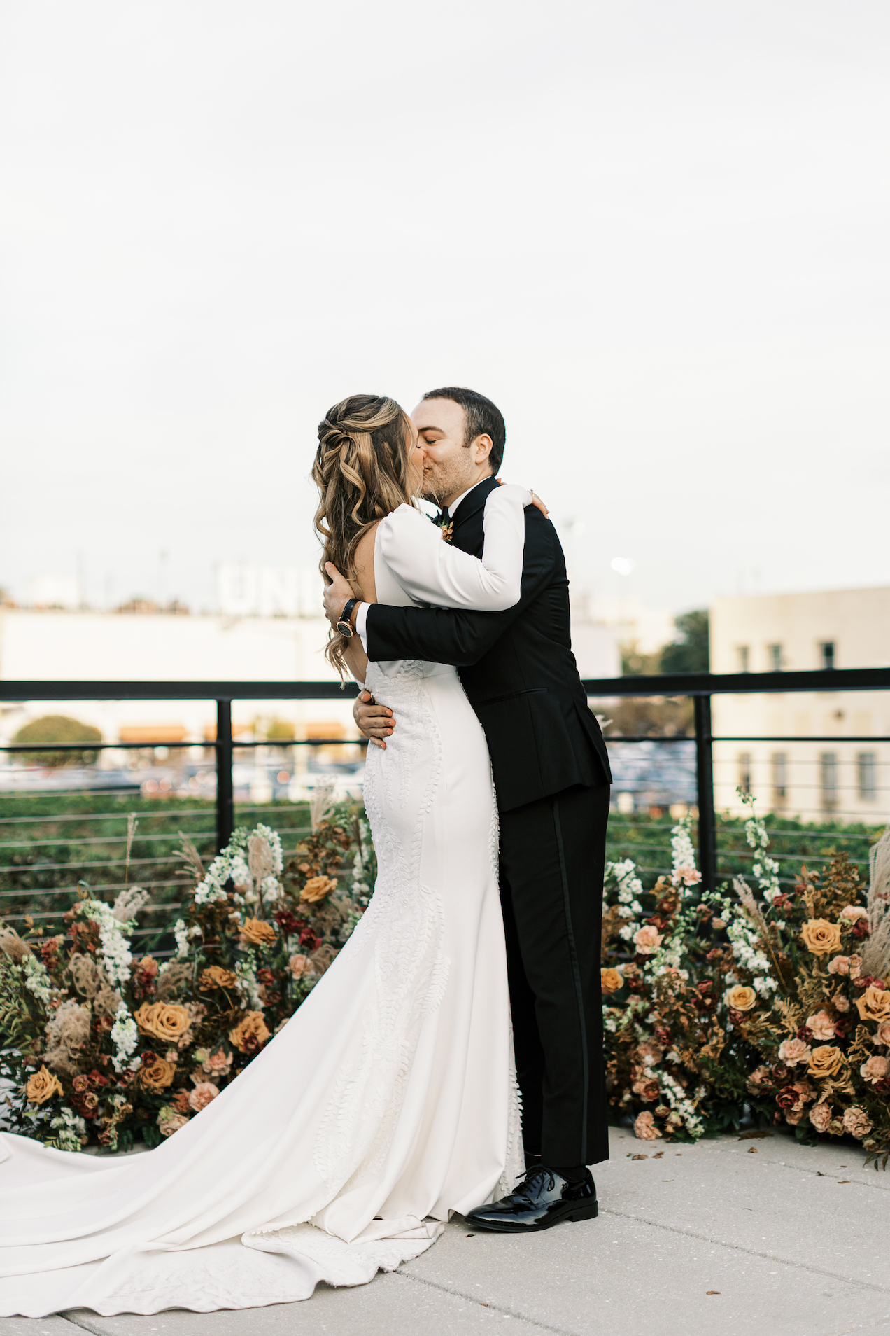 Their “industrial, modern, moody” wedding at AutoShop in November was decorated in emerald green, terra cotta, burgundy, gold, and copper. Rachel’s favorite details were the copper bar back, which she says tied in well with the venue vibe and the color scheme, and the floral arrangements on the bar. Matthew’s favorite detail was the audio guestbook: “Sitting down together a few weeks after the wedding and listening to all the audio messages was such an amazing experience. It will be something we’ll cherish forever.” The morning after the big day, the pair hosted their guests for a brunch at Bluestone Lane next to the hotel (The Darcy), where they debriefed and hung out with friends and family. Check out all the industrial fall details of the big day below.