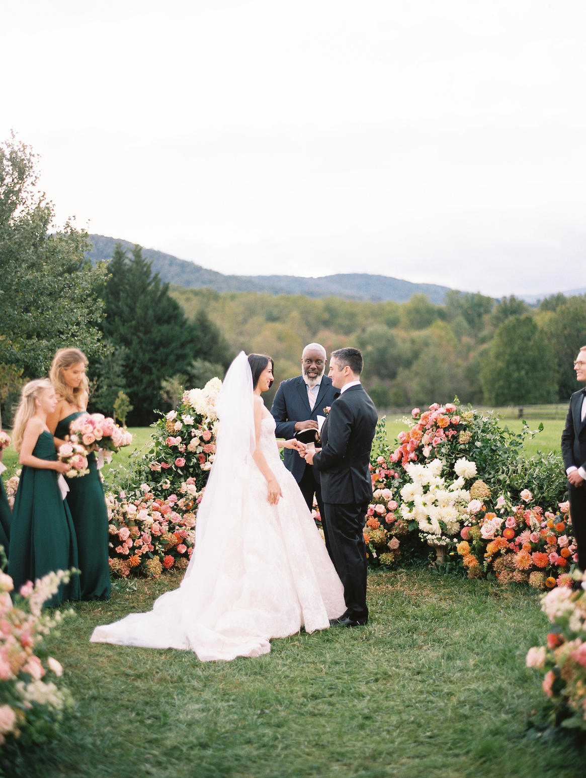 Photographer: Abby Jiu | Venue: The Inn at Little Washington | Event planning and design: Mariee Ami | Florist: Holly Chapple | Invitations: Mariee Ami | Cake: Fleur and Flour | Hair and makeup: Jessie D’Angelo | Bride’s Attire: Monique Lhuillier from Carines Bridal (custom gown); Dolce & Gabbana (shoes) | Groom’s Attire: Black tuxedo and Astronaut Cufflinks by Jan Leslie | Bridesmaids’ Attire: varying emerald gowns from David’s Bridal | Rentals: Select Event Group