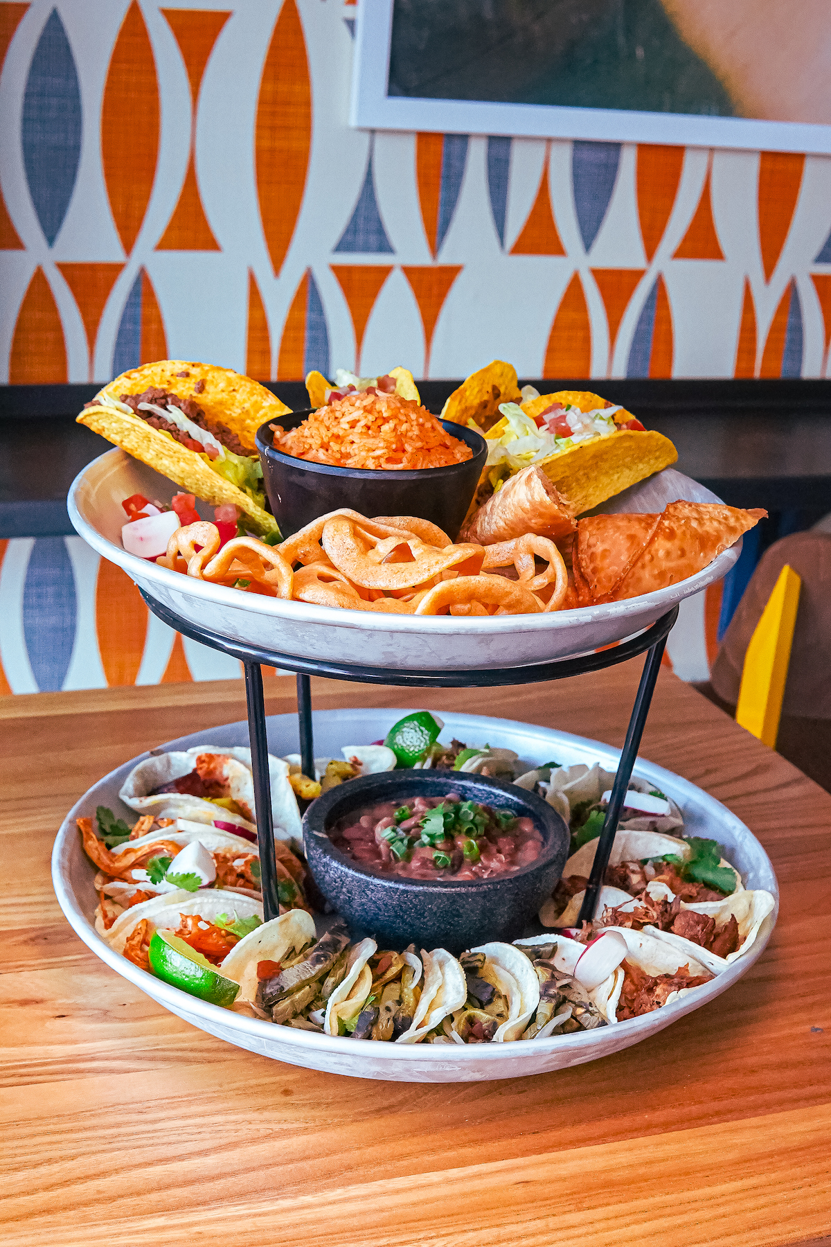 Lloyd tapped his longtime Le Dip sous chef Alfredo Solano to direct the kitchen. The Guerrero native brings classic flavors in the form of ceviches, street-style tacos stuffed with crispy fish or chili-rubbed pork, and braised birria. The chefs are also paying homage to their former French workplace with a showstopper plateau—here loaded with tacos, chimichangas, Taki pies (like a Frito pie, but with Takis tortilla chips), fresh salsas, guacamoles, and more.