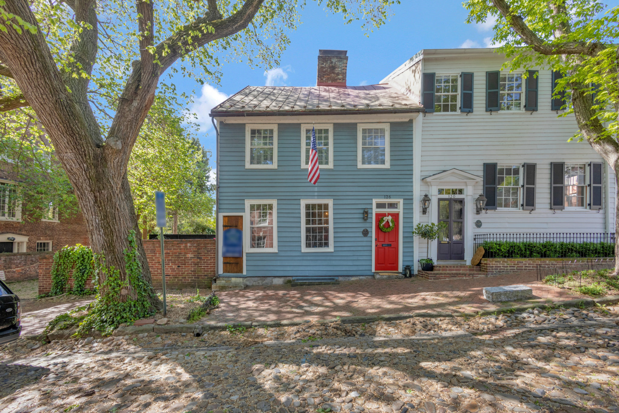 On historic Captain’s Row, this semi-detached rowhouse was built in 1783 and is one of two in Alexandria with original hand-hewn wood siding. With over 2,200 square feet of space, the townhouse comes with three bedrooms and four bathrooms across three levels. The living room features stone and brickwork with a fireplace, and the kitchen includes a copper farmhouse sink and a Viking oven and stove. There’s also a brick patio out back.