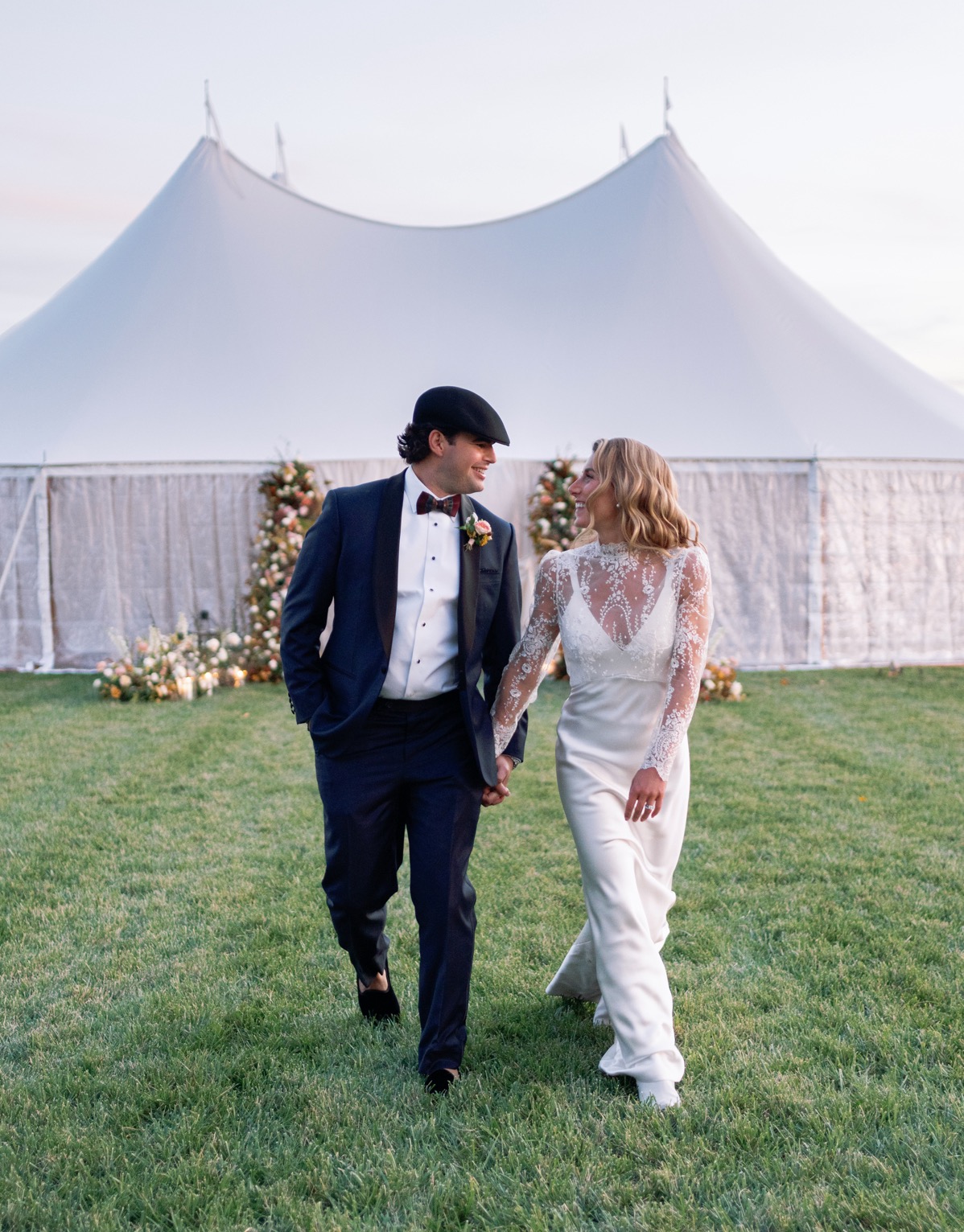 They started to plan a destination wedding in Italy but changed course with just three months to go, deciding instead on November nuptials at Tusculum Farm, the groom’s family’s 500-acre property in Montgomery County, on which Wild Tribe Co. set up a tent village where the bridal party stayed for the weekend. Three days of celebration with a “feel the farm” vibe kicked off with warm pretzels, apple pie, and a caramel-apple dipping station, plus a Dixie band and hand-rolled cigars at the barn party. On Saturday, an apple-cider bar greeted guests at the ceremony, and an oyster station displayed in a wooden boat was the focal point at cocktail hour. At the reception, a cowbell escort display, antler chandeliers, and a plaid dance floor reflected the autumnal, farm-inspired theme. Signature drinks were a bourbon-based cinnamon-apple/ginger-beer concoction and a Paloma. Later, espresso martinis helped keep the party going. Before the goodbyes, Nick’s mother surprised the newlyweds and guests with a fireworks display.