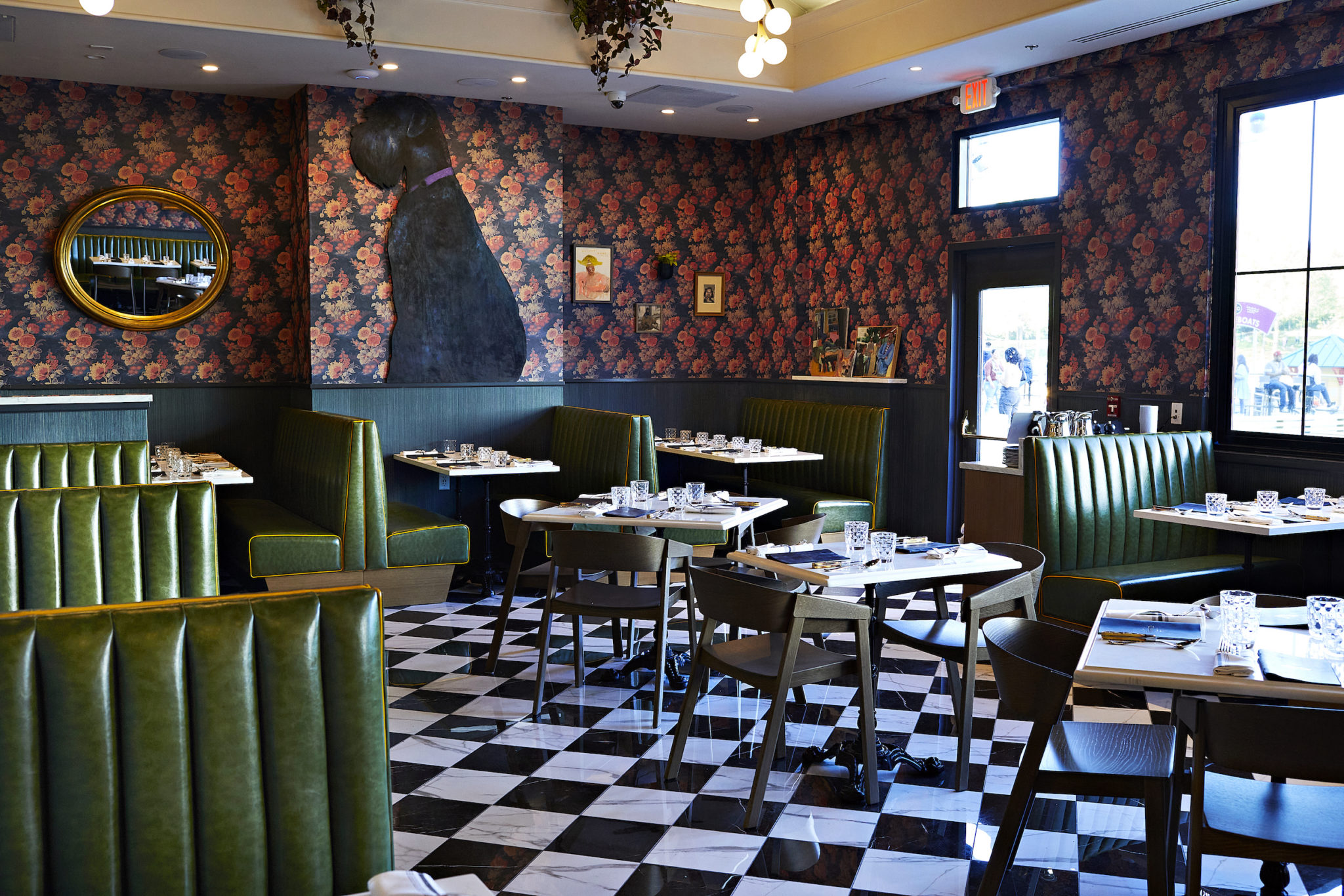 The 90-seat dining room channels the dark and cozy vibes of semi-subterranean Bar Charley but with floral wall paper, deep green booths, and black-and-white checkered floors. Did you know Greenbaum is painter? Her work—along with art that was previously hanging in her own home—line the walls. Her goal is to paint portraits of her business partners and their families to add to the collection.