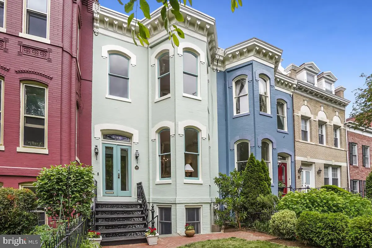 This townhouse in Capitol Hill offers four bedrooms and three-and-a-half bathrooms across 3,043 square feet. The living room features curved bay windows and a fireplace with a slate mantel. The kitchen leads out to a private back patio and garden. Upstairs, the large primary suite also has curved bay windows, and the en suite bathroom features a glass-door shower and tub. The finished basement has a kitchen, living area, bedroom, and bathroom.