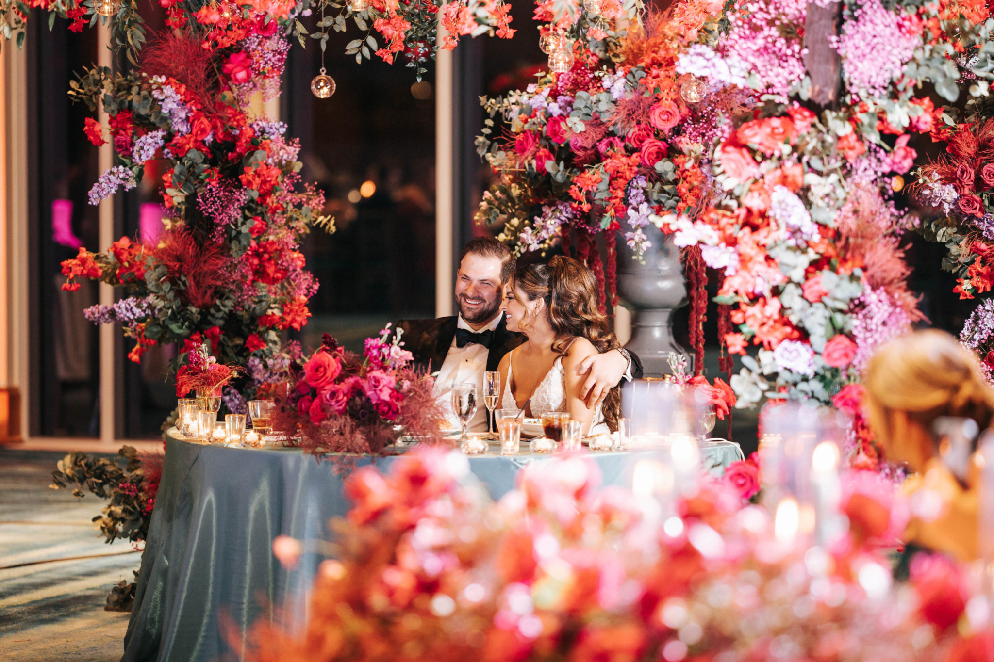 The 180-person affair featured a “modern South Indian” theme with a color palette of magenta, fuchsia, and teal. Among the bride’s favorite parts of the day were seeing her friends and family meet and celebrate together, and aesthetically, the mandap flowers and decor. As for the groom: the food. “Definitely the food,” he says. Lunch included a buffet of traditional Indian dishes, and dinner was a choice of filet, butter chicken, or sea bass. Another favorite detail for Noah: Riding in an Aston Martin during the baraat.